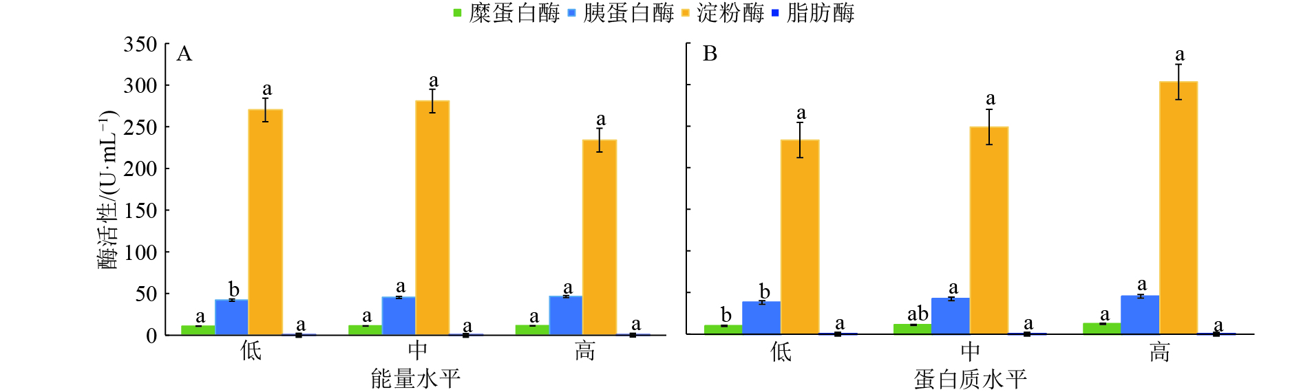 图 1 不同日粮能量或蛋白质水平下的番鸭空肠液中消化酶活性 Fig. 1 Digestive enzyme activities in jejunal fluid of Muscovy duck under different dietary energy or protein levels 低、中和高能量组脂肪酶活力分别为0.042 5、0.033 3和0.046 9 U·mL–1;低、中和高蛋白质组脂肪酶活力分别为0.042 3、0.043 8和0.075 4 U·mL–1;各图中同种酶不同处理间凡具有一个相同小写字母者,表示差异不显著(P>0.05,Duncan’s 法) |