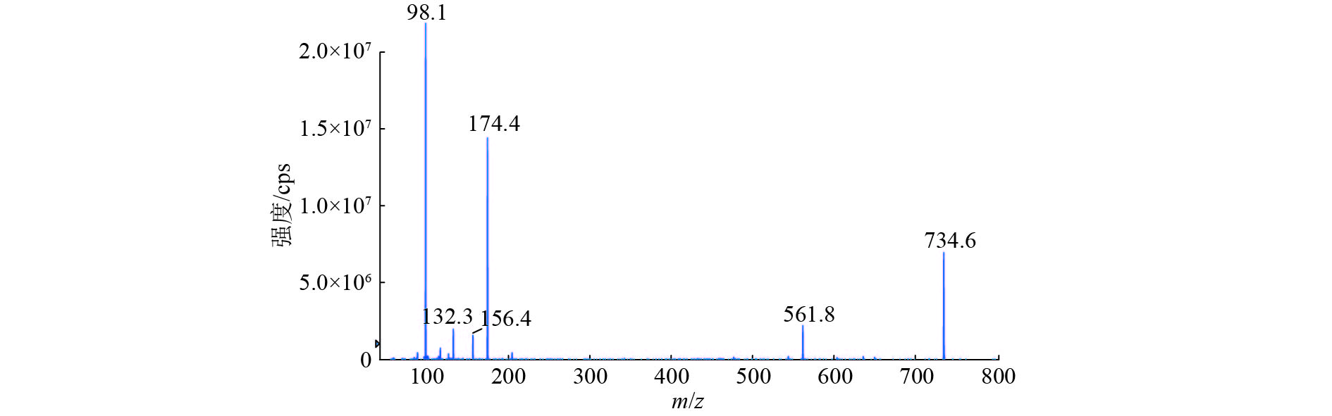 2 结果与分析 2.1 质谱参数确定分别采用电喷雾离子源正离子与负离子扫描,用蠕动泵将泰地罗新标准工作液以10 μL·min–1的速度注入离子源中,结果显示正离子模式下泰地罗新响应值更高,并得到[M+H]+(m/z734.6)和[M+2H]2+(m/z 368.2)准分子离子峰,对比发现[M+H]+(m/z 734.6)具有更高的响应值。进行二级质谱扫描,对去簇电压、碰撞能量等参数进行调整优化,选择响应值高,峰形无干扰的特征子离子,最终以m/z 98.1作为泰地罗新定量离子,以m/z 174.4作为定性离子。泰地罗新的二级质谱图见图2。