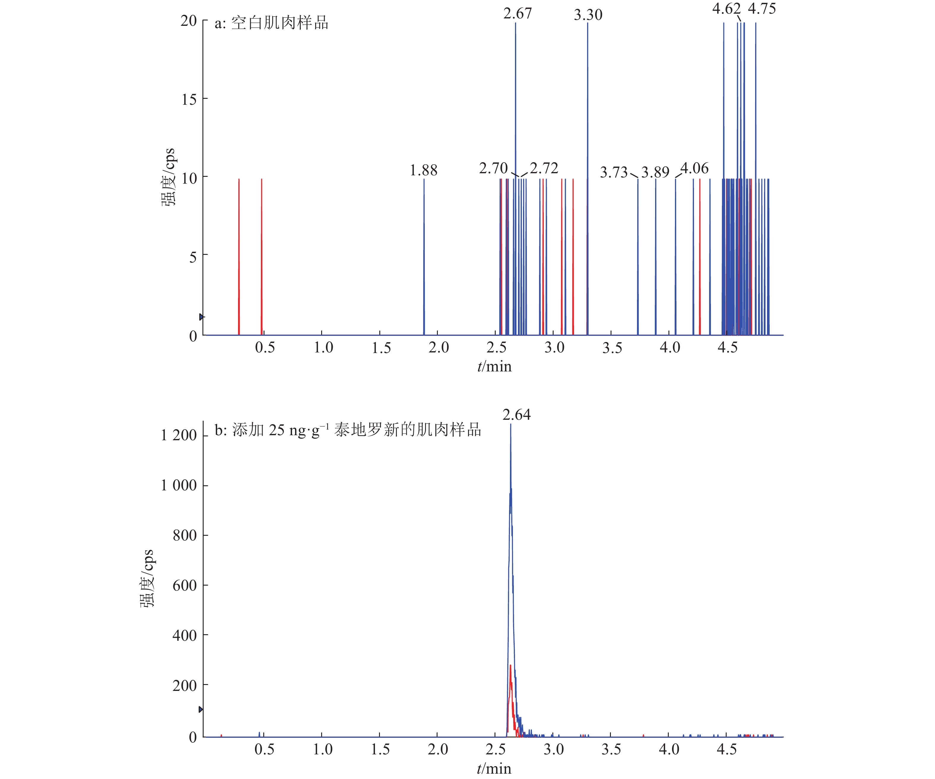 分析猪肌肉、肝脏、肾脏和皮脂样品时,特征离子质量色谱图中目标化合物的保留时间处没有杂质干扰,表明该方法有较好的特异性。空白肌肉样品及添加25 ng·g–1泰地罗新的肌肉样品特征离子质量色谱图见图3。