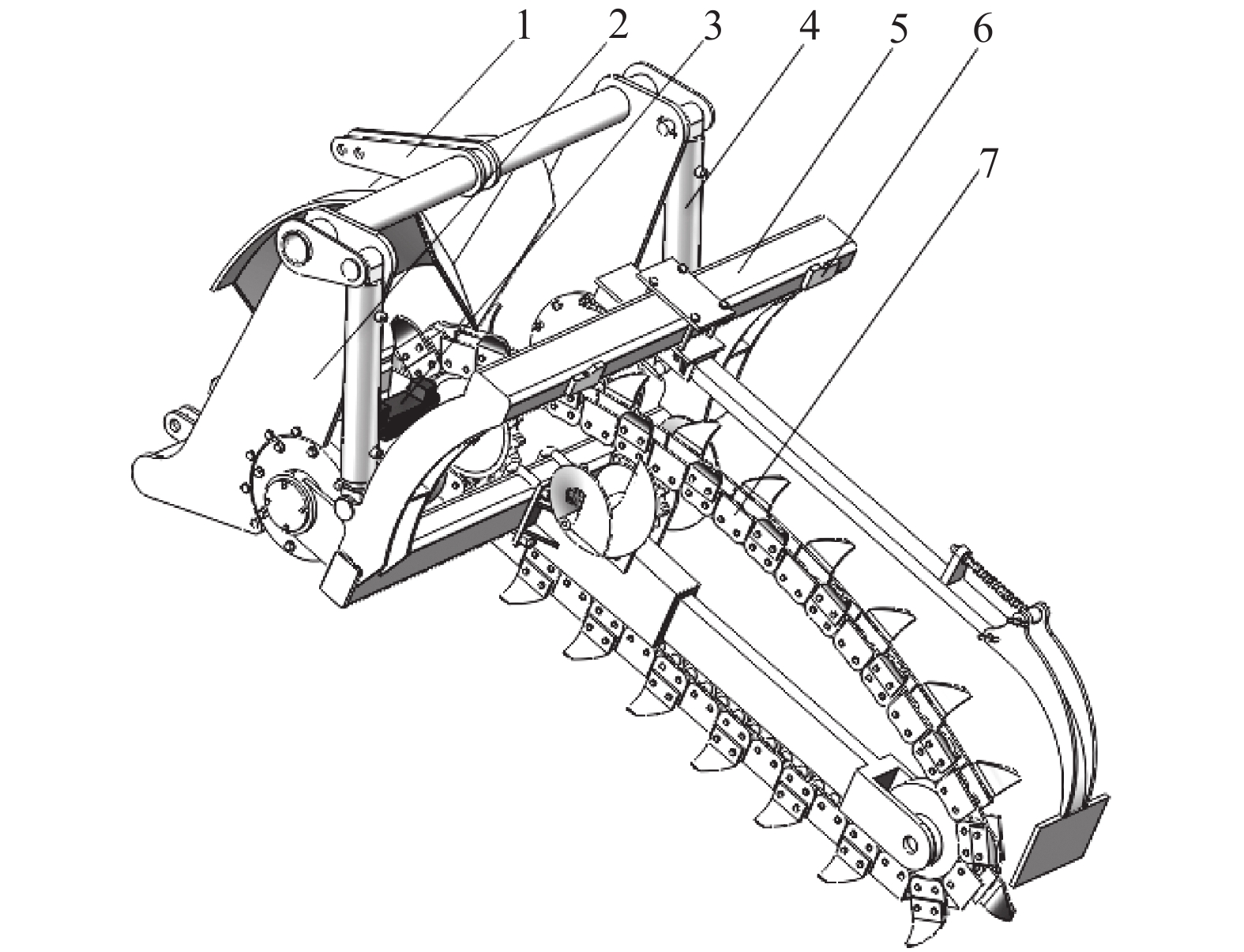 图 2 链式开沟机结构图 Fig. 2 The structure diagram of chain trencher 1:挂接机构;2:机架;3:控制阀组;4:液压缸;5:升降架;6:激光传感器;7:开沟链组合 |