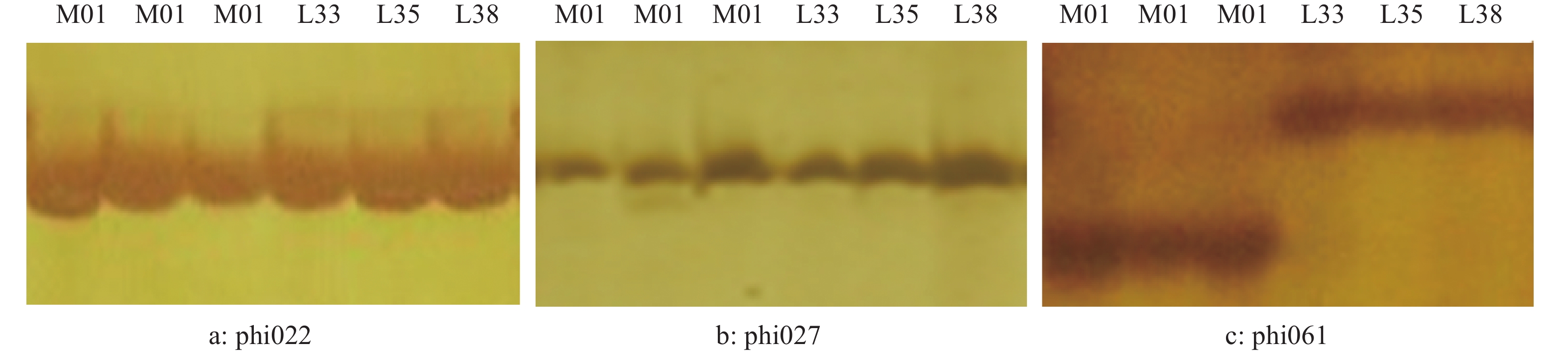 图 1 引物phi022、phi027、phi061在甜玉米自交系和糯玉米自交系之间的多态性筛选 Fig. 1 The polymorphism screenings between sweet corn line (M01) and wax corn lines (L33, L35 and L38) by phi022, phi027 and phi061 primers |