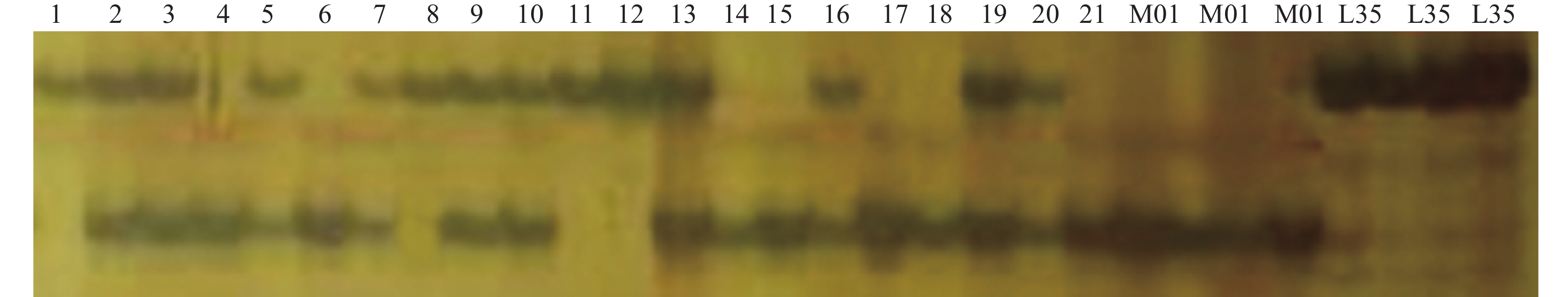 图 2 利用引物phi061鉴定L35×M01得到的F2群体中的双隐性植株 Fig. 2 The identifications of double recessive sweet-waxy plants by primer phi061 in F2 populations obtained from L35×M01 1~21为以L35×M01得到的F2群体全基因组DNA为模板的PCR扩增产物,其中1、8、11和12为双隐性纯合单株;M01:甜玉米亲本,L35:糯玉米亲本 From one to 21 indicate the PCR amplification products from F2 population genomic DNA obtained from L35 × M01. 1, 8, 11 and 12 indicate their corresponded plants with double recessive sweet-waxy genotype; M01: Sweet corn parental line, L35: Waxy corn parental line |