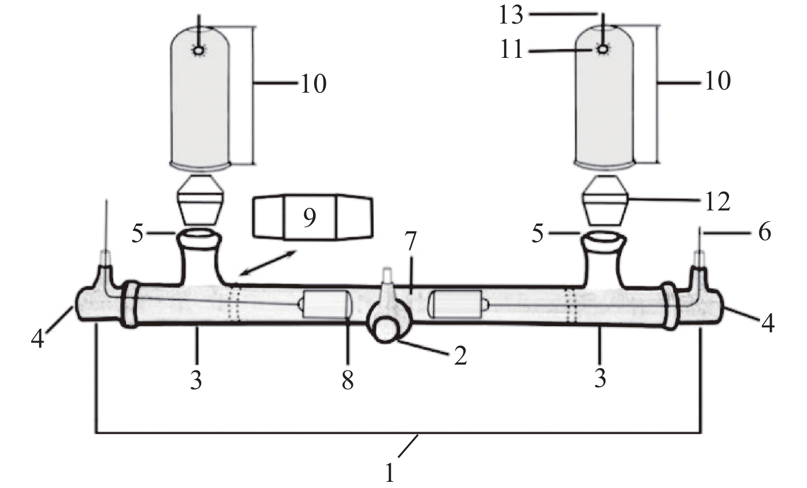 图 1 趋光行为反应装置 Fig. 1 Phototactic test instrument 1:昆虫趋光行为选择管;2:供试昆虫释放口;3:选择臂;4:臂端控制口;5:趋光行为选择口;6:控制绳;7:供试昆虫栖息室;8:活动限制子;9:部件连接装置;10:光源陷阱装置;11:光源;12:陷阱连接装置;13:电源 1: The main phototactic tube; 2: The entrance of insects; 3: The selection arm; 4: The entrance of control rope; 5: The phototactic selection window; 6: The control rope; 7: The habitat room of insects; 8: The control factor of habitat room size; 9: The connector of instrument; 10: The catching jar; 11: The LED; 12: The connector of catching jar; 13: The power |