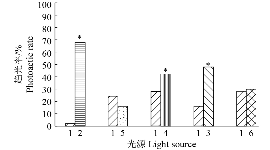 图 2 柑橘木虱趋光行为 Fig. 2 Phototactic behavior response of Diaphorina citri adults 1:白光,2:紫外光(365~370 nm),3:蓝光(470~475 nm),4:绿光(520~525 nm),5:红光(620~630 nm),6:黄光(590~592 nm);“*”表示与白光差异显著(P<0.05,t检验) 1: White light, 2: Ultraviolet (365~370 nm), 3: Blue light (470~475 nm), 4: Green light (520~525 nm), 5: Red light (620~630 nm), 6: Yellow light (590~592 nm); “*” meaned significant difference compared with white light (P<0.05, t test) |