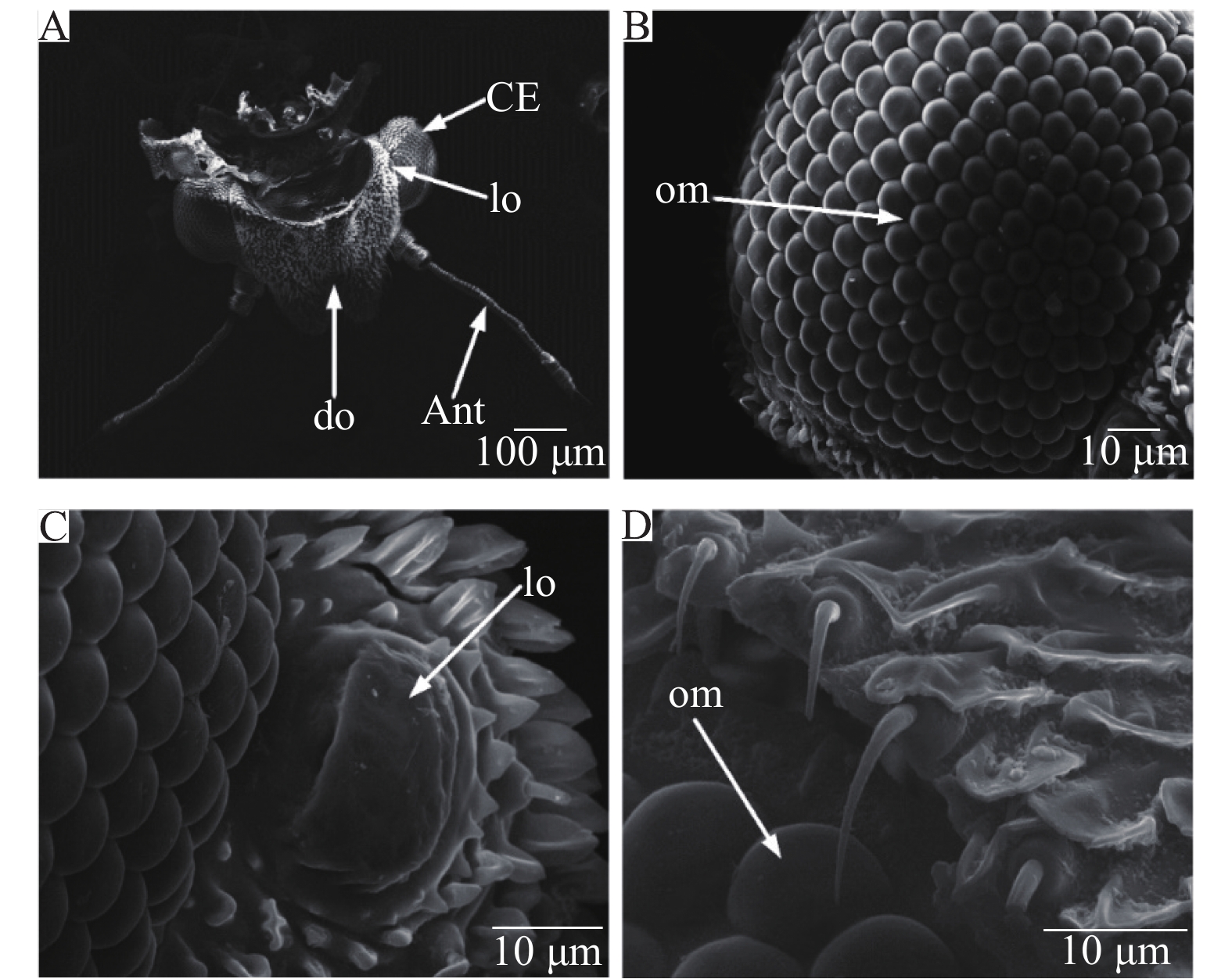图 3 柑橘木虱成虫复眼外部形态 Fig. 3 The external morphology of compound eyes of Diaphorina citri adults A:成虫头部,B:复眼,C:侧单眼,D:边缘小眼;Ant:触角,do:背单眼,CE:复眼,lo:侧单眼,om:小眼 A: Head of D. citri adult, B: Compound eyes, C: Lateral ocellus, D: Ommatidium at the edge of compound eyes; Ant: Antenna, do: Dorsal ocellus, CE: Compound eyes, lo: Lateral ocellus, om: Ommatidium |