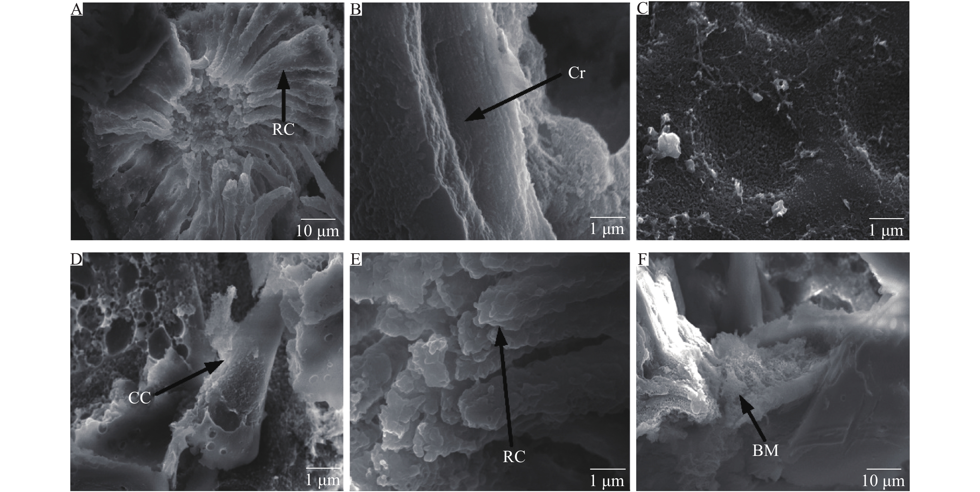 图 4 柑橘木虱成虫复眼内部形态 Fig. 4 The internal morphology of compound eyes of Diaphorina citri adults A:复眼内部,B:角膜,C:角膜内表面,D:晶锥细胞,E:视杆远心端,F:基膜,RC:视网膜细胞,Cr:角膜,CC:晶锥细胞,BM:基膜 A: Internal of compound eyes, B: Cornea, C: Internal surface of the cornea, D: Crystalline cone, E: Distal of rhabdom, F: Basement membrane; RC: Retinula cell, Cr: Cornea, CC: Crystalline cone, BM: Basement membrane |
