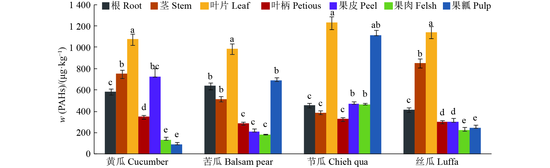 3.5 结论1) PAHs在同种瓜类蔬菜不同部位的含量规律为:黄瓜,叶片>茎>果皮>根>叶柄>果肉>果瓤;苦瓜,叶片>果瓤>根>茎>叶柄>果皮>果肉;节瓜,叶片>果瓤>果皮>果肉>根>茎>叶柄;丝瓜,叶片>茎>根>果皮>叶柄>果瓤>果肉。