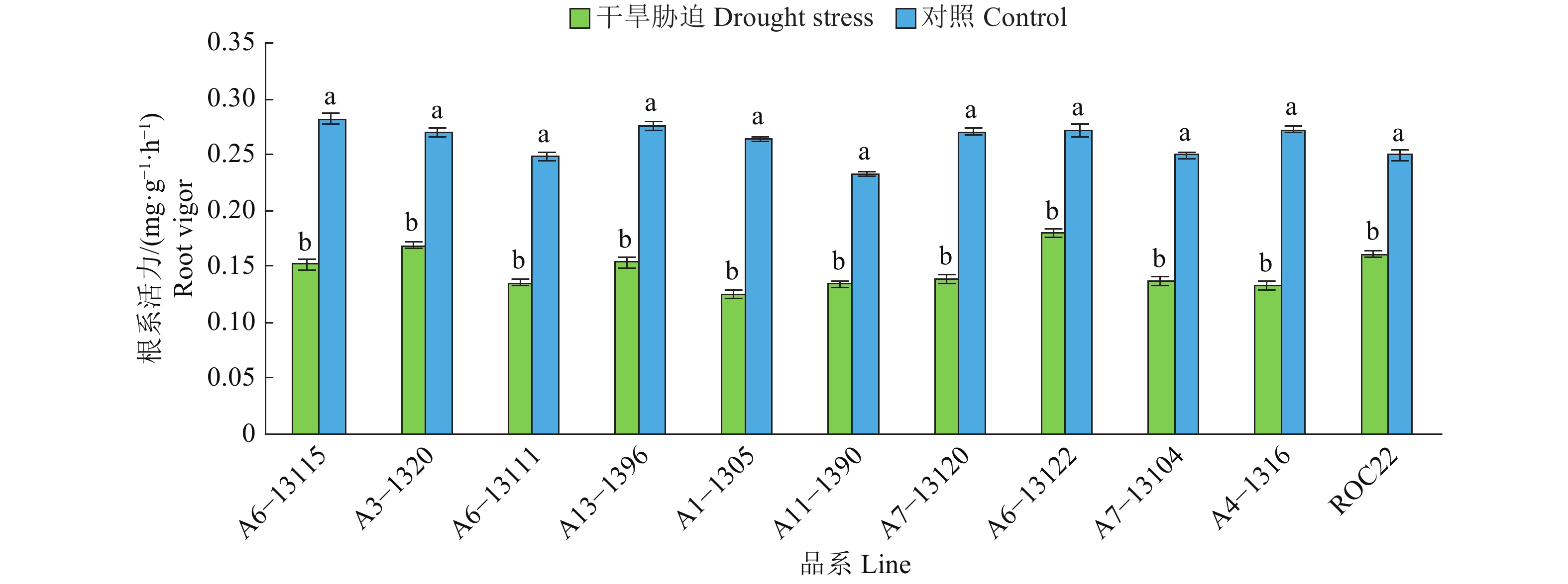 图 1 干旱胁迫对甘蔗根系活力的影响 Fig. 1 Effect of drought stress on root vitality of sugarcane 相同品系(品种)柱形图上的不同小写字母,表示差异显著(P<0.05,Duncan’ s法) Different lowercase letters on bars of the same sugarcane line (cultivar) indicate significant differences (P<0.05, Duncan’ s method) |