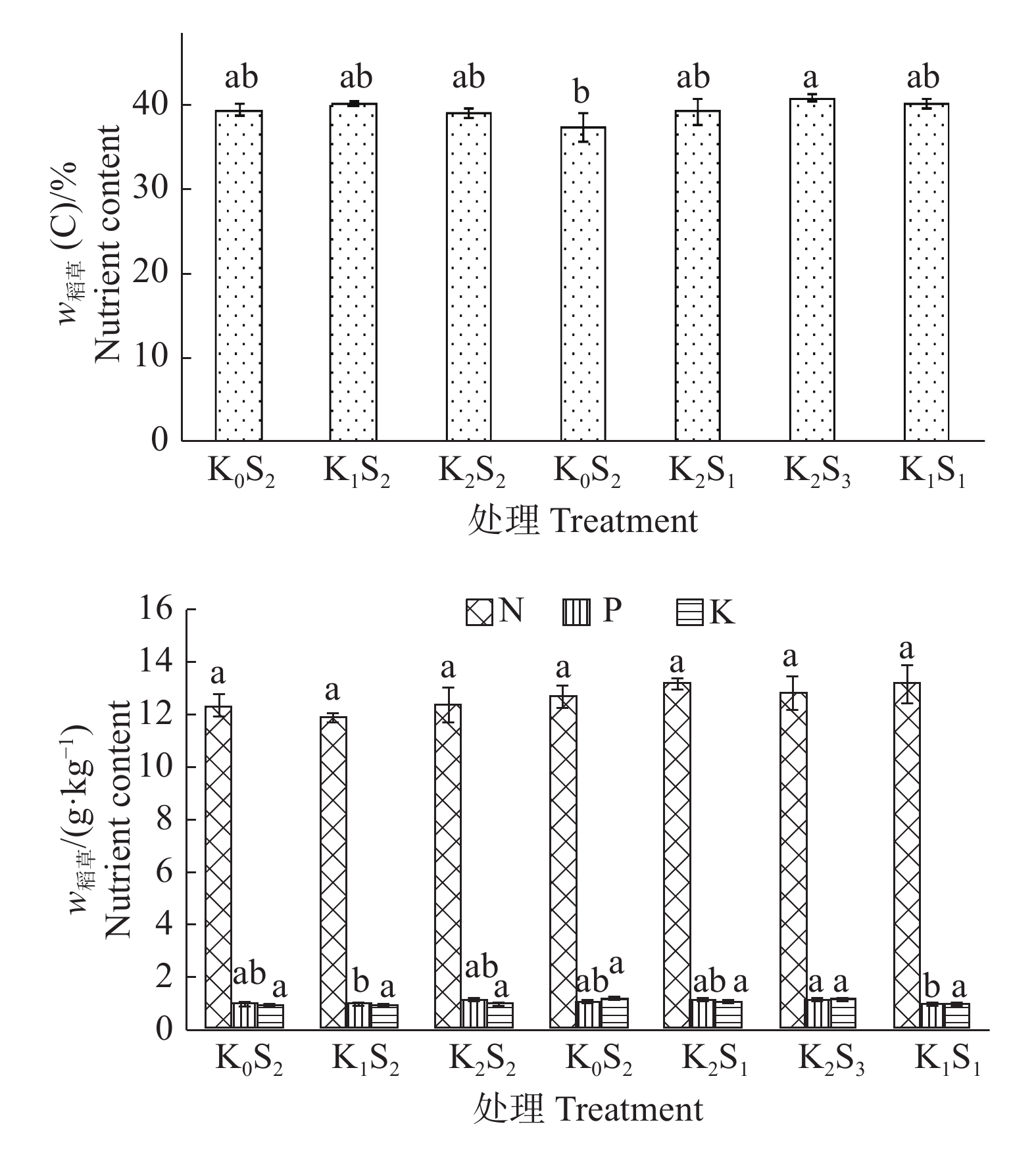 2 结果与分析 2.1 稻草钾肥配施对稻草养分含量的影响稻草覆盖还田前各养分质量分数为:全C 41.01%、全N 8.51 g/kg、全P 0.98 g/kg和全K 17.10 g/kg。马铃薯收获时(覆盖后82 d),稻草养分含量状况见图1,稻草C质量分数平均为39.41%,稻草N、P和K质量分数平均分别为12.64、1.06和1.03 g/kg。与覆盖前初始值相比,稻草中C和P含量变化较小,K含量降低最为明显,降幅达到93.96%,而N含量有较大增幅,较覆盖前增加了49.22%。不同处理之间稻草N和K含量没有显著差异(P>0.05),而对稻草C和P含量产生一定影响。稻草C、P和K含量均以稻草施用量最多的处理K2S3(9 000 kg/hm2)最高,其中,稻草C含量显著高于K0S2处理(P<0.05),P含量显著高于K1S2处理(P<0.05)。