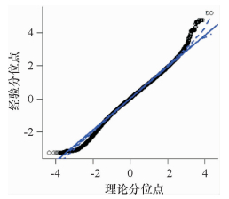 2 结果与分析 2.1 初生窝重性状及方差组分估计初生窝重数据量达到76 710条,平均数为15.76 kg,标准差为4.64 kg,最小值和最大值分别为0.50和40.0 kg,另外根据偏度(-0.18)、峰度(0.54)和Q-Q plot图(图 1),可判断初生窝重基本符合正态分布。