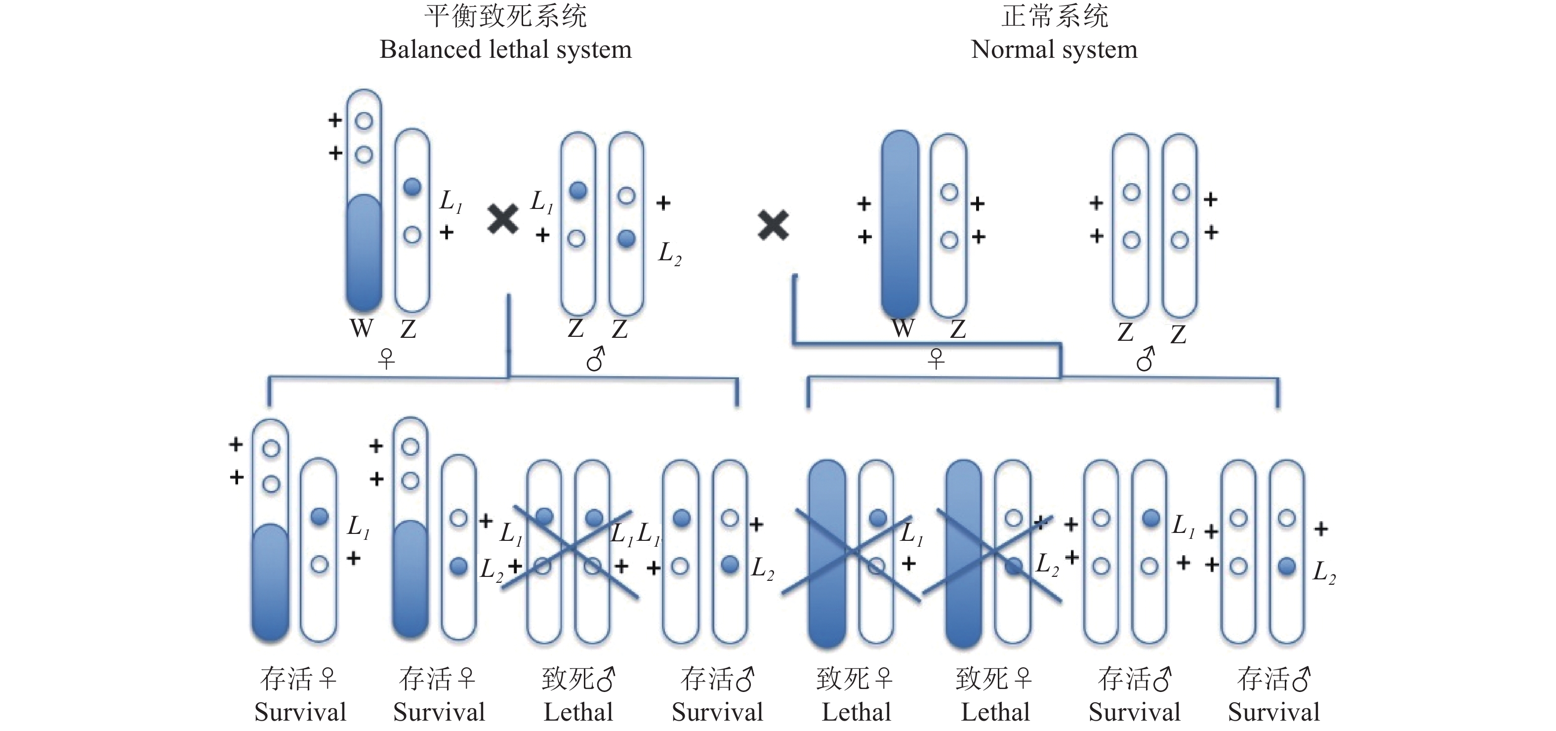 1.1 性连锁平衡致死系统平衡致死系统即一对同源染色体分别带有一个座位不同的隐性致死基因,这2个致死基因始终处在对应的染色体上,以杂合状态保存不发生分离[15]。1975年,Strunnikov[16]用经典遗传学建立了家蚕Bombyx mori的性连锁平衡致死系统。该系统利用雄性与雌性杂交,后代只有雄性正常孵化,而雌性在胚胎期死亡,实现只养雄蚕的目的。性连锁平衡致死系统中,雄蚕的2条Z染色体分别带有一个非等位突变致死基因L1和L2,当突变基因发生纯合时,雌蚕致死(图1)。
