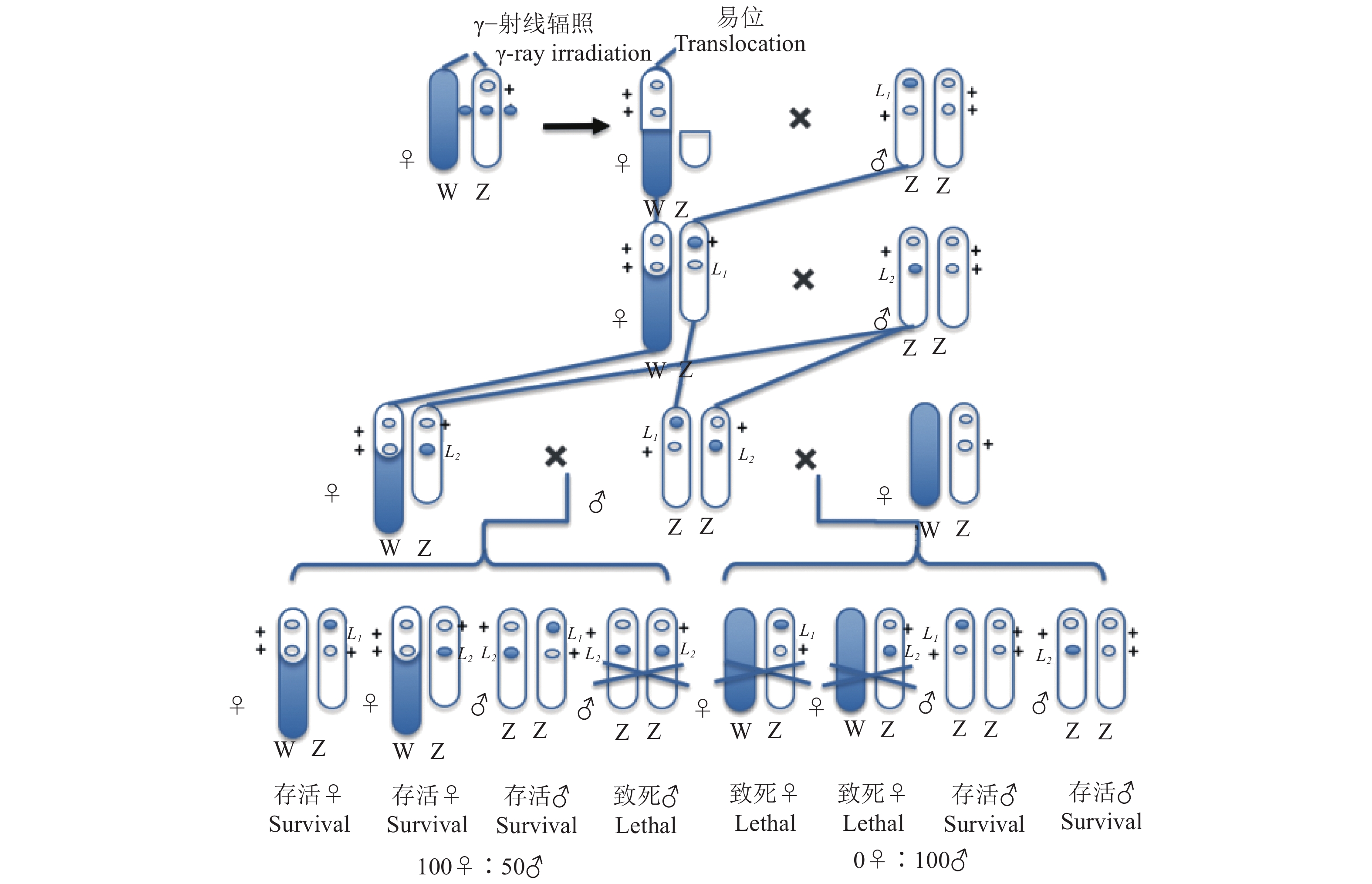 另一种是Z−W易位平衡致死系统[17](图2)。通过电离辐射把 Z 染色体左端的片段切下并使之易位到W染色体上,断裂的染色体剩余部分在以后的杂交中被正常的Z染色体所替代。染色体的改变产生了新的家蚕品系,其雌虫有一套Z−W染色体,雄虫跟正常的雄性一样, 存在2个Z染色体片段,被易位到W染色体上的Z染色体片段掩盖了相应的正常等位基因,该雌虫能够存活并且把致死基因传递给自己的雄性后代。依次杂交,易位处理雌虫先与一个带有致死基因的雄虫交配, 子代再与带有另一个异质结合致死基因的雄虫交配,成功育成了一个新的具有2个平衡致死基因的品系。由于2条Z染色体基因交换的影响, 所以性比通常是99.9♂∶0.1♀ ,在F1中任何一个雄性个体都带有来自父本的一个致死基因,这种雄性个体与正常雌性个体杂交所产生的后代, 性比为2♀ ∶1♂ [18-19]。何克荣等[20]已经把平衡致死系统的性别控制基因成功导入活体中,选育出实用的雄蚕品种。