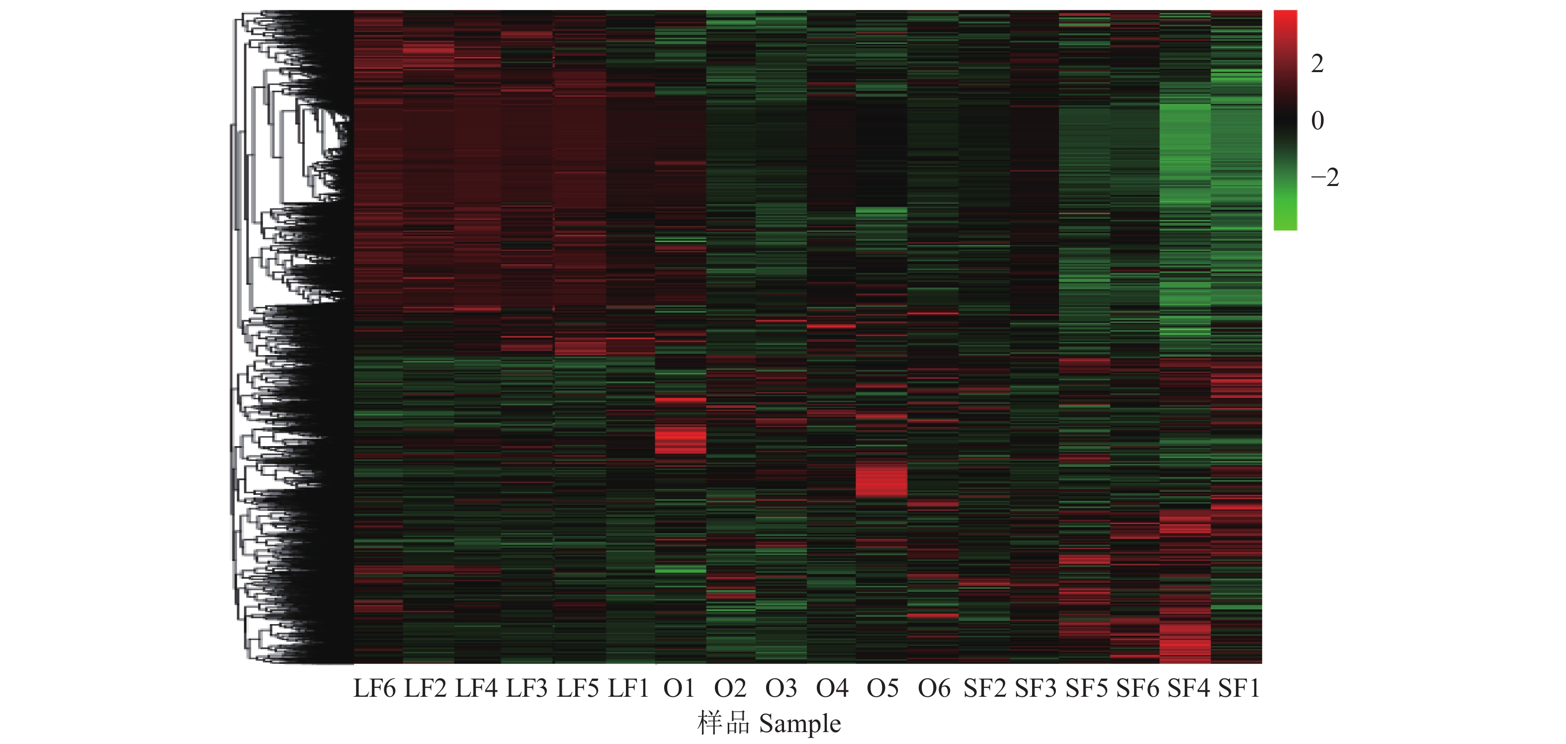 图 1 不同卵巢部位间差异表达基因的聚类图 Fig. 1 Cluster analysis of differentially expressed genes among different parts of ovary O:卵巢基质;LF:大卵泡;SF:小卵泡;图例右侧的数字为基因表达上调或下调的倍数 O: Ovarian stroma; LF: Large follicle; SF: Small follicle; Numbers by the legend are expression fold-changes for up- or down-regulated genes |
