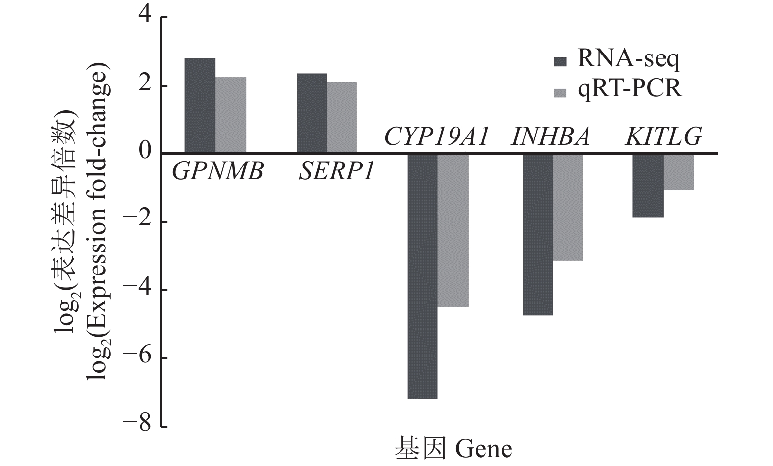 从3组差异基因中筛选5个基因,分别是CYP19A1和INHBA(卵巢基质vs大卵泡)、GPNMB(卵巢基质vs小卵泡)、KITLG和SFRP1(小卵泡vs大卵泡),进行qRT-PCR验证(图2)。这些基因的表达变化趋势与测序结果基本一致,说明测序结果可靠。