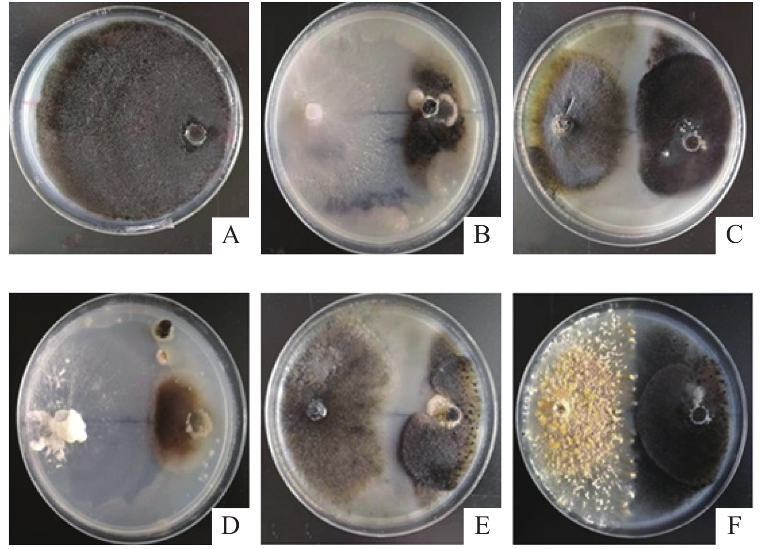 图 1 铁皮石斛内生真菌对胶孢炭疽菌生长的影响 Fig. 1 The effects of fungal endophytes from Dendrobium officinale on the growth of Colletotrichum gloeosporioides A为胶孢炭疽菌株生长7 d后的菌落形态;B、C、D、E、F分别为胶孢炭疽菌株与F84、F123、F31、F100、F05菌株共培养7 d后的菌落形态 A shows the colony morphology of C. gloeosporioides strains growing for 7 days; B, C, D, E and F are the colony morphologies of C. gloeosporioides growing with strains F84, F123, F31, F100 and F05, respectively, for 7 days |