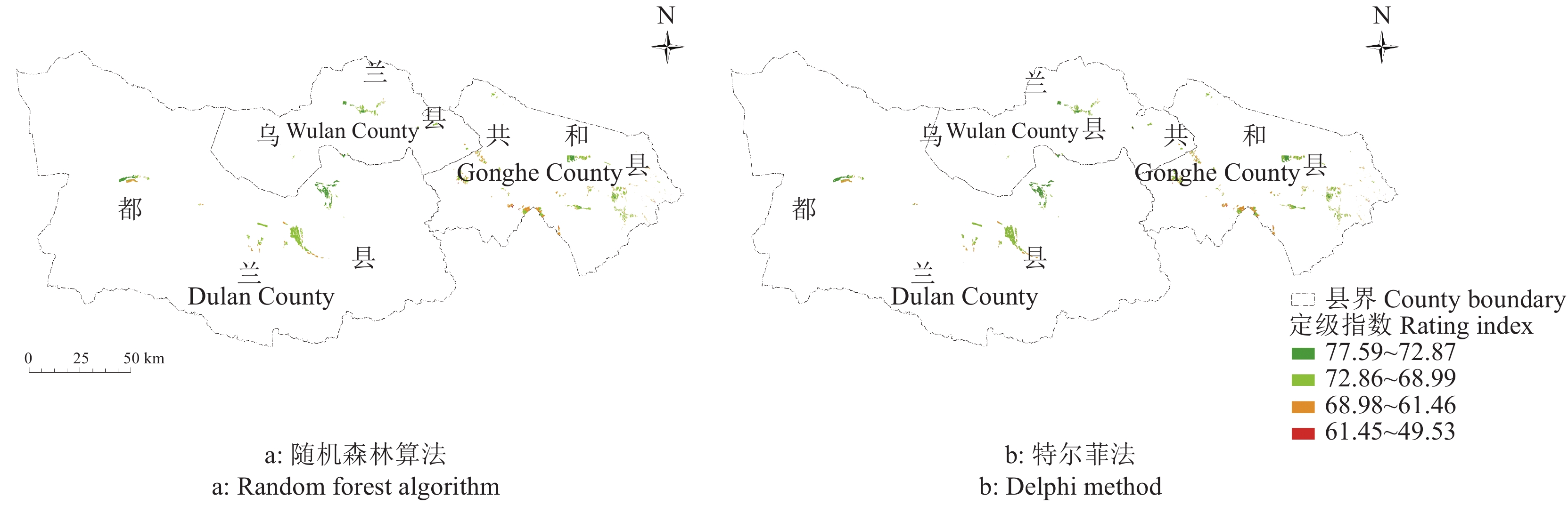 其次,在东北−西南样带第110 km处,随机森林算法的定级结果显著高于特尔菲法的定级结果。此处耕地位于柴达木盆地的东部,年总太阳辐射量为6 735 MJ·m-2,生长季平均气温为11~12 ℃,生态系统脆弱性类型为略脆弱型。在研究区域中该位置耕地的太阳辐射量较大,生长季气温高,生态环境比较稳定,是青海省著名的春小麦高产区。表明随机森林算法能够通过变量重要性值大小的设置,充分体现以上定级指标对耕地质量的正向影响作用,有效识别出研究区域的优质高产耕地,修正研究区域中高值低估的状况。另外,在西北−东南样带第290 km位置,随机森林算法的定级结果显著低于特尔菲法。该区域靠近城镇及国道,生长季温度为10~11 ℃,生长季温度较高,降水比较充足,区位和交通条件优越。然而该区域位于研究区域中人口总量最多的共和县,耕地开发程度较高,生态系统脆弱性类型为一般脆弱型,人与自然矛盾比较突出,脆弱的生态环境限制了耕地的耕作;另外,该地区的太阳辐射量为研究区较低的区域,较大地限制了耕地作物的产量。表明由于特尔菲法定级指标体系的定级指标过多,各定级指标权重值的差异较小,无法突出一些重要的定级指标,定级结果易受到多影响因素的综合影响,造成低值高估的现象。总之,随机森林算法稳定性更好,级别指数变幅区间更小,更有利于构建省级空间尺度的耕地级别可比序列。