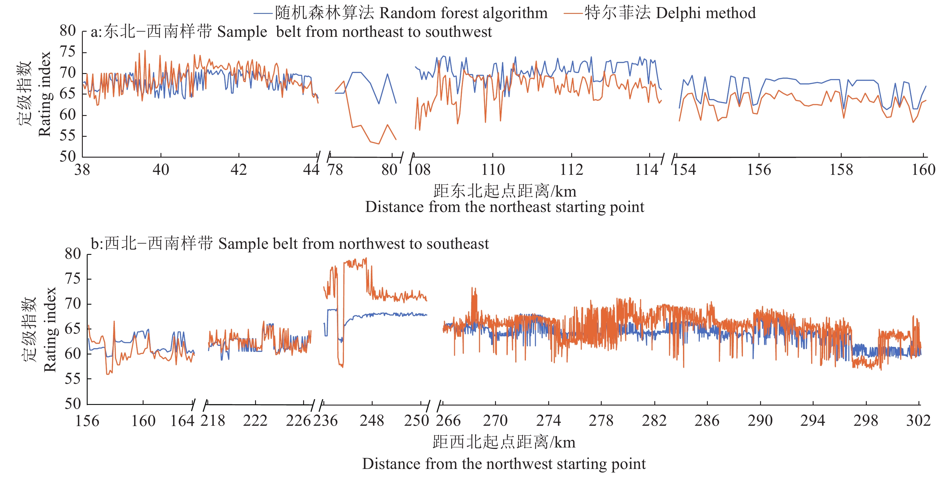 图 4 随机森林算法和特尔菲法对2条样带定级结果的对比 Fig. 4 Comparison of grading results of random forest method and Delphi method to two sample belts |