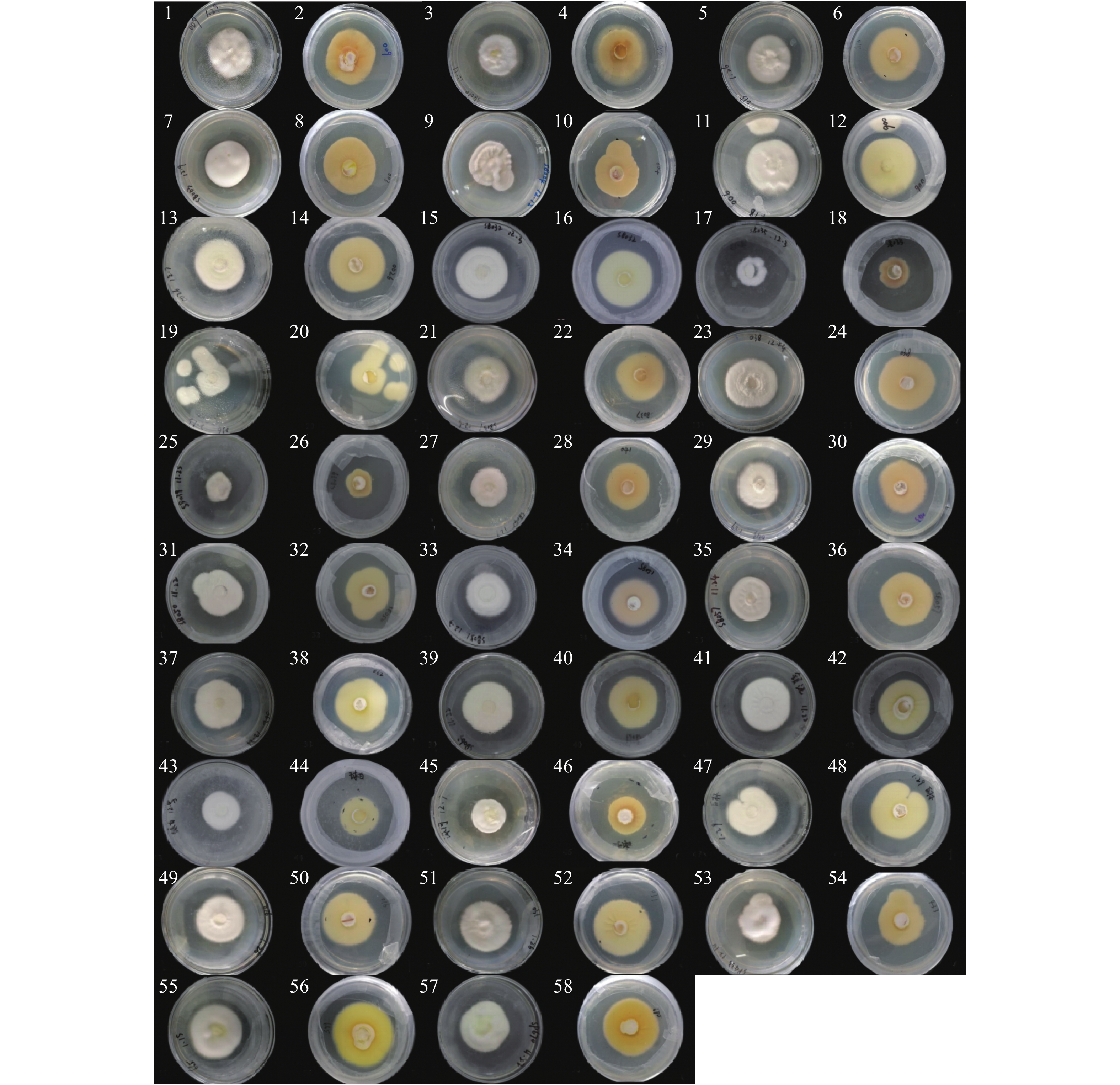 图 1 菌株的菌落形态(奇数为正面,偶数为反面) Fig. 1 Colony morphology of strain(the odd number showed the front and the even number showed the back ) 1、2:SB003;3、4:SB004;5、6:SB006;7、8: SB009;;9、10:SB010;11、12:SB015;13、14: SB026;15、16:SB032;17、18:SB035;19、20:SB036;21、22:SB037;23、24:SB038;25、26:SB039;27、28:SB041;29、30:SB043;31、32:SB050;33、34:SB051;35、36:SB057;37、38:SB062;39、40:SB063;41、42:SB671;43、44:SB672;45、46:SB673;47、48:SB674;49、50:SP016;51、52:SP031;53、54:SP433;55、56:SP665;57、58:SP670 |