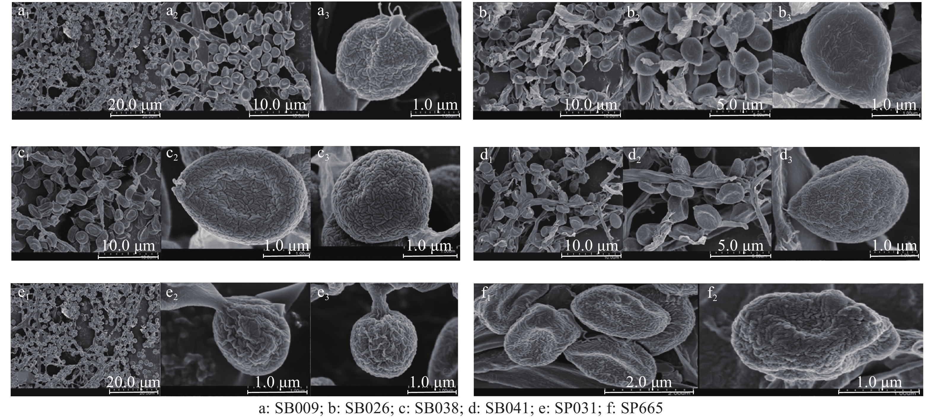 2.1.2 孢子的扫描电镜观察菌株SB009的孢子呈卵形和近球形,孢子直径1.8~2.2 µm (图2a)。菌株SB026的孢子呈卵形,孢子直径1.8~2.4 µm (图2b)。菌株SB038产孢细胞的基部膨大,产孢轴“Z”型弯曲,分生孢子有球形和卵形,孢子直径1.7~2.6 µm (图2c)。SB041 孢子形状和大小与SB009比较类似,孢子卵形,部分为近球形,直径1.6~2.5 µm (图2d)。SP031孢子有球形,也有椭圆形,孢子大小1.3~1.5 µm (图2e)。SP665分生孢子梗不规则分枝,长短不一,基部拟椭圆形膨大,变细成明显的颈部。分生孢子球形或椭圆,孢子直径1.4~2.2 µm (图2f)。