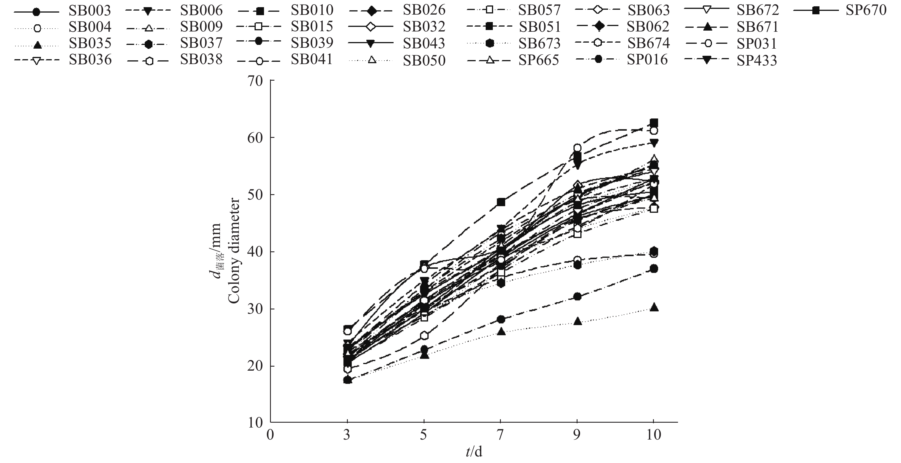 虫生真菌的各菌落生长速率见图3,菌株培养前期(3 d),菌株的菌落直径差异不明显,菌株SB010和SP031的直径大于25.0 mm,菌株SB038、SB035、SB039的直径小于20.0 mm,其他菌株的菌落直径为20.8~24.3 mm,菌株间无明显差异;随着培养时间的延长,菌株的菌落直径差异增加,菌株培养5d时,菌株SB010、SB032、SP031、SB006的菌落直径大于35.0 mm,菌株SB010的菌落直径最大,为37.9 mm,菌株SB039与SB035的菌落直径偏小,不到25.0 mm;培养7 d时,菌落直径达40.0 mm以上的菌株占供试菌株的一半,而菌株SB035与SB039的菌落直径却不到30.0 mm;培养9 d时,菌株SP031、SB010、SB006、SB032、SB671、SB062、SB037、SB672的菌落直径达50.0 mm及以上,而菌株SB035的菌落直径仍不到30.0 mm;培养10 d时,菌株SB010与SP031已达60.0 mm以上,分别为62.7 和61.3 mm,生长速率最快;菌株SB041、SB039和SB035的菌落直径不到40.0 mm,菌株SB035的菌落直径仍为各菌株中菌落直径最小的,仅有30.3 mm。