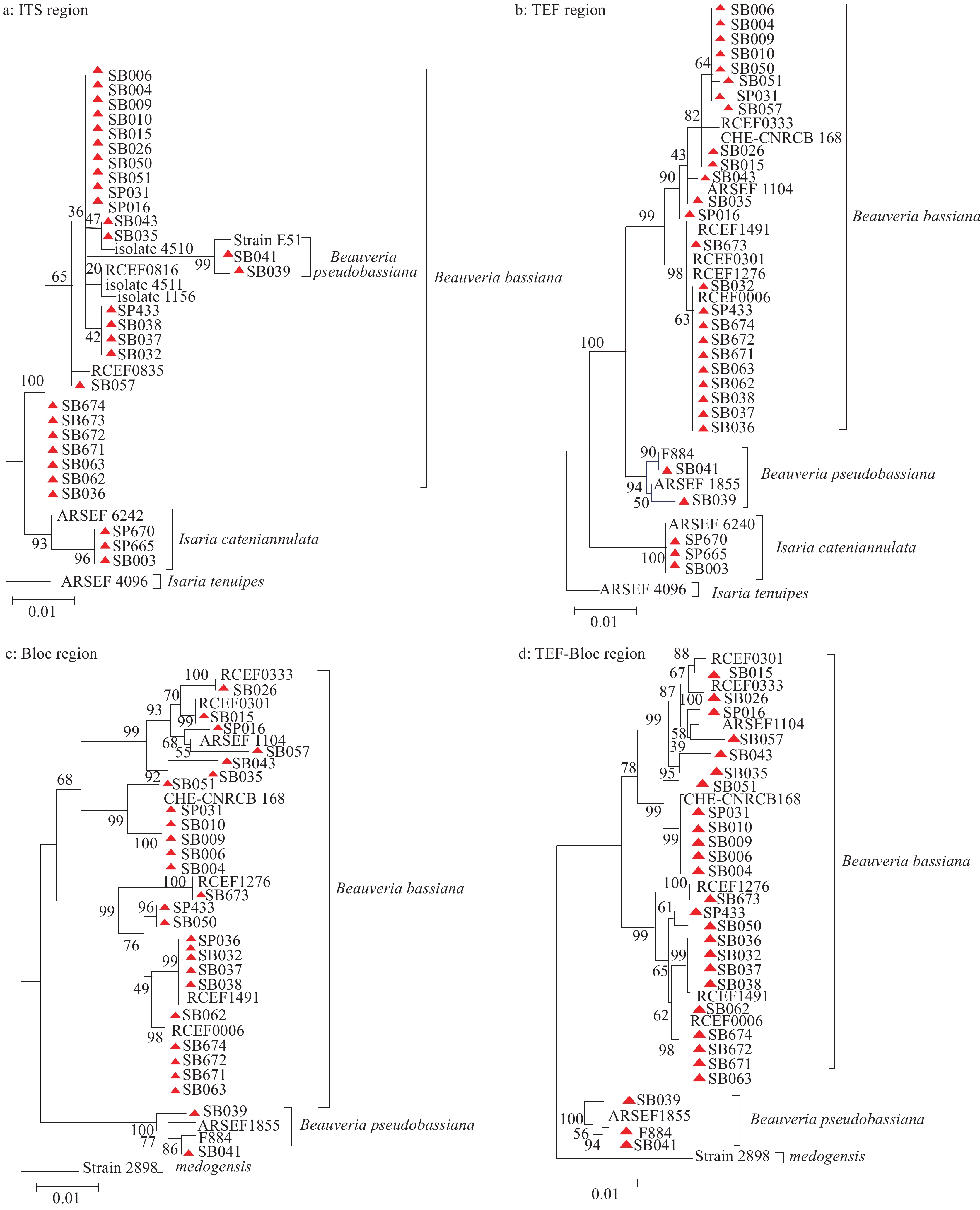 将供试的29株菌株的ITS序列、TEF序列和Bloc序列采用最大似然法建树建立系统发育树(图4)。ITS序列构建的系统发育树(图4a)分为2大分支,第1分支为假环链棒束孢ARSEF 6242与供试菌株SB003、SP665和SP670,因此可把它们归为环链棒束孢;第2大分支为白僵菌属,24株供试菌株与白僵菌属的不同球孢白僵菌类聚,为球孢白僵菌,但其中菌株SB039、SB041与Strain E51类聚1分支,为假球孢白僵菌。