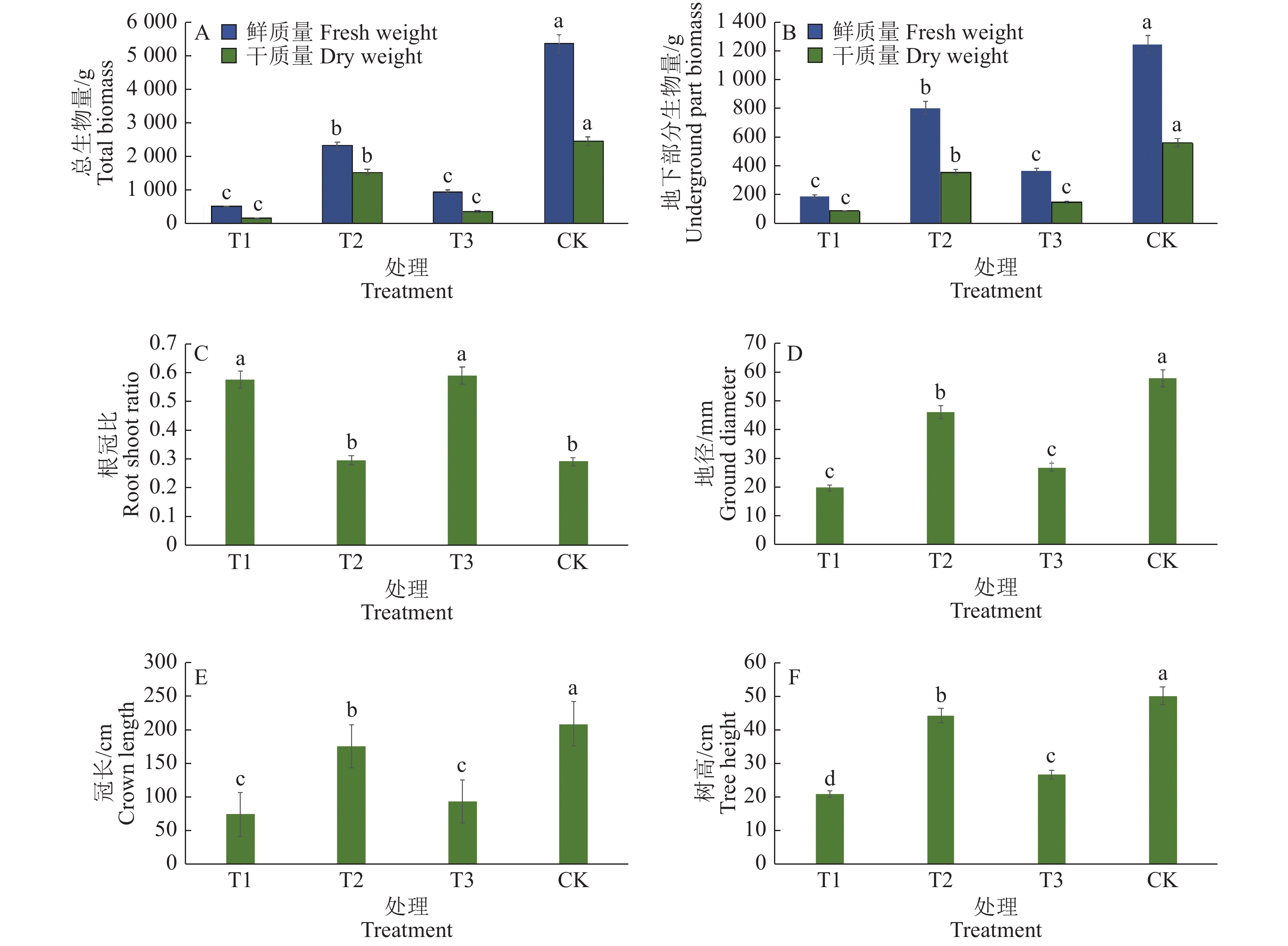 1.2 试验方法 1.2.1 生长指标测定对4种处理下生长18个月的植物样本进行生长指标测定。采用测量杆测定树高、冠长等指标,采用游标卡尺测定地径。收集4种处理下的植物样本测定生物量,采用托盘天平测量新鲜样本的叶片、主干、侧枝和根的鲜质量;将所有样本组织放入75 ℃烘箱48 h后,测量各处理叶片、主干、侧枝和根的干质量。