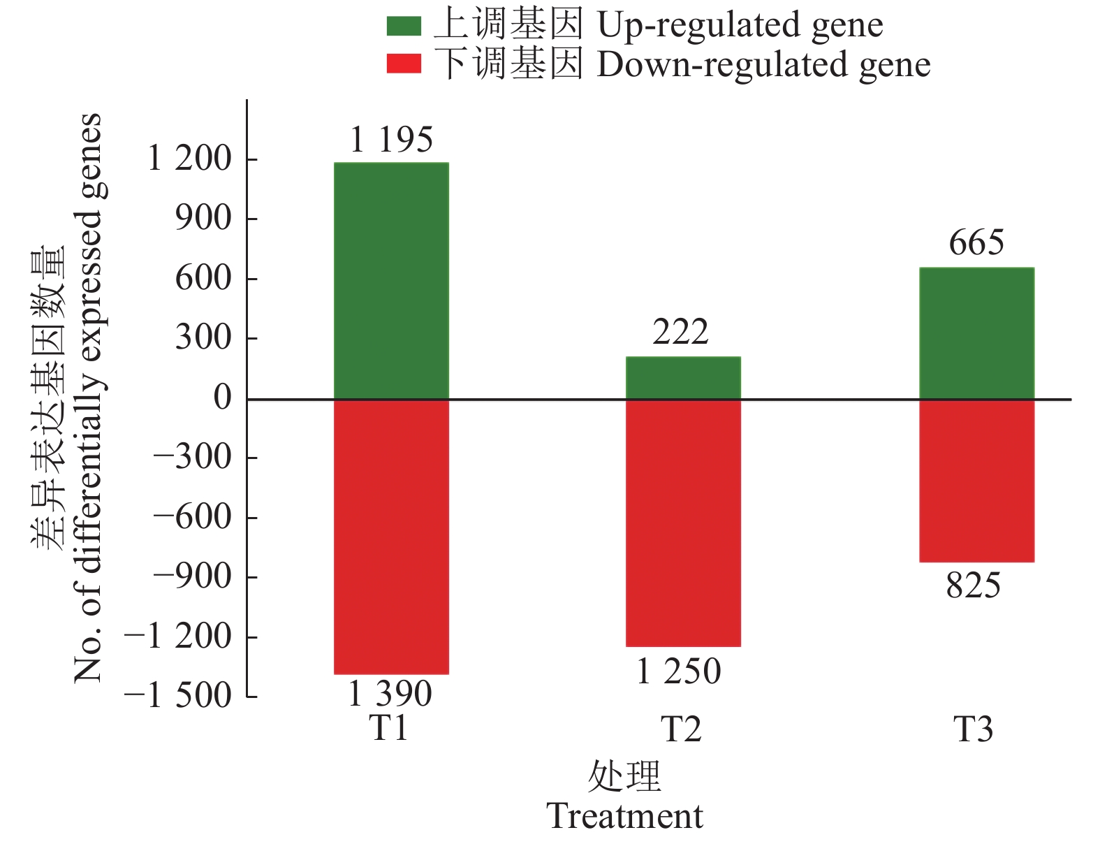 图 2 3种胁迫处理中尾叶桉差异表达基因分布情况 Fig. 2 Distribution of differentially expressed genes of Eucalyptus urophylla in three stress treatments T1:水肥双因素胁迫,T2:水分单因素胁迫,T3:养分单因素胁迫 T1: Water and nutrient deficiency stress, T2: Water deficiency stress, T3: Nutrient deficiency stress |