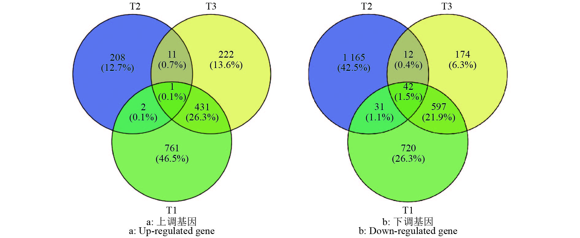 图 3 3种胁迫处理中尾叶桉差异表达基因韦恩图 Fig. 3 Venn diagram of differentially expressed genes of Eucalyptus urophylla in three stress treatments T1:水肥双因素胁迫,T2:水分单因素胁迫,T3:养分单因素胁迫;括号中的百分数表示该基因在所有上调或下调基因中占的比例 T1: water and nutrient deficiency stress, T2: water deficiency stress, T3: Nutrient deficiency stress; The percentage in parenthesis indicates the proportion of the gene in all up-regulated or down-regulated genes |