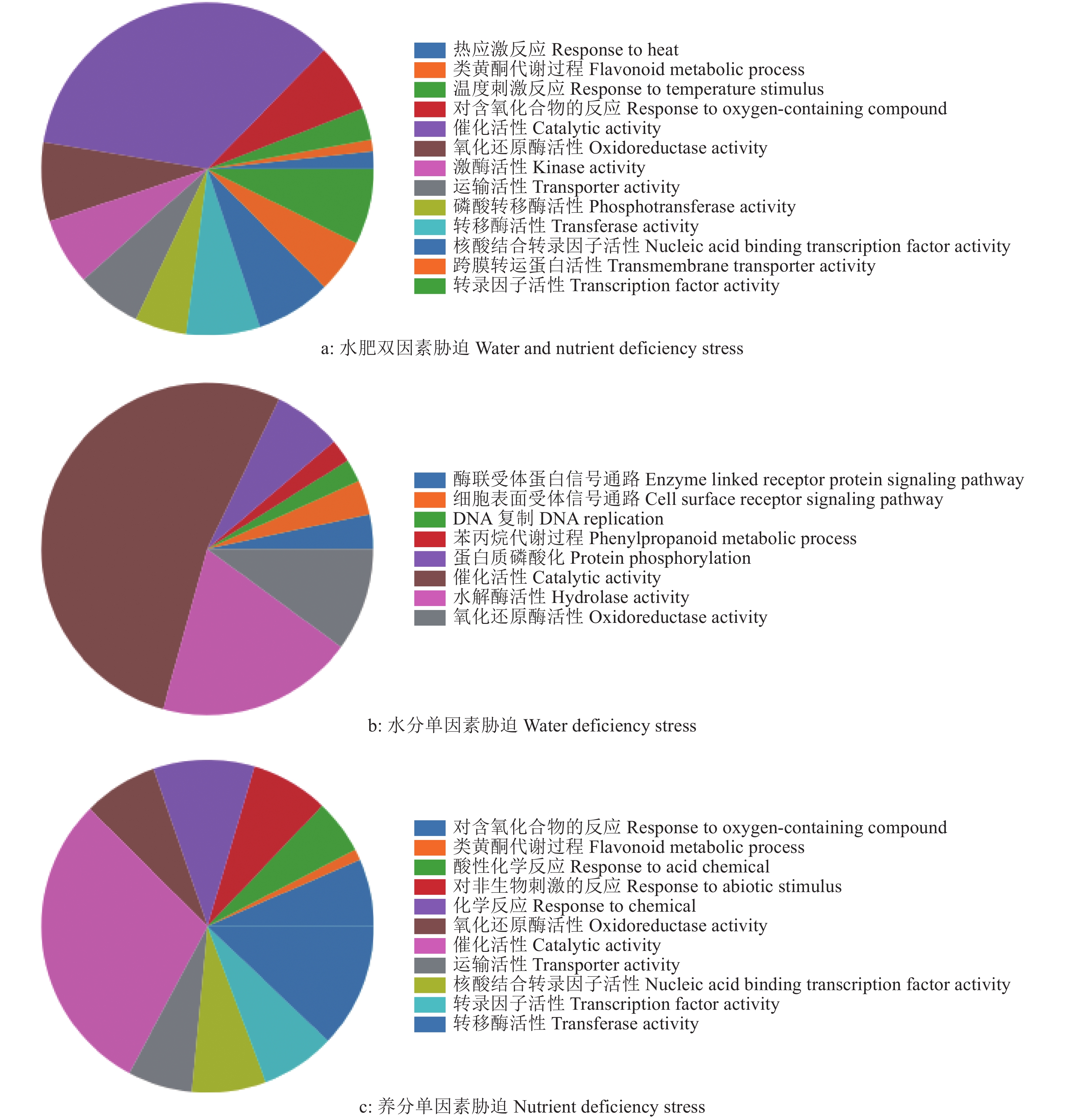 为了研究不同处理条件下差异表达基因的生物学功能,对差异表达基因进行GO和KEGG分类。GO分类结果(图4)显示,水肥双因素胁迫的差异表达基因显著富集于35个类别中,分别为生物过程中的类黄酮代谢过程、跨膜转运蛋白活性等,分子功能中的转移酶活性、催化活性等;水分单因素胁迫的差异表达基因显著富集于42个GO分类中,包括生物过程中的苯丙烷代谢过程、细胞表面受体信号通路,分子功能中的催化活性、氧化还原酶活性等;养分单因素胁迫的差异表达基因显著富集在50个GO类别中,在生物过程中显著富集于运输活性、类黄酮代谢过程等,在分子功能中显著富集于运输活性、转移酶活性等。