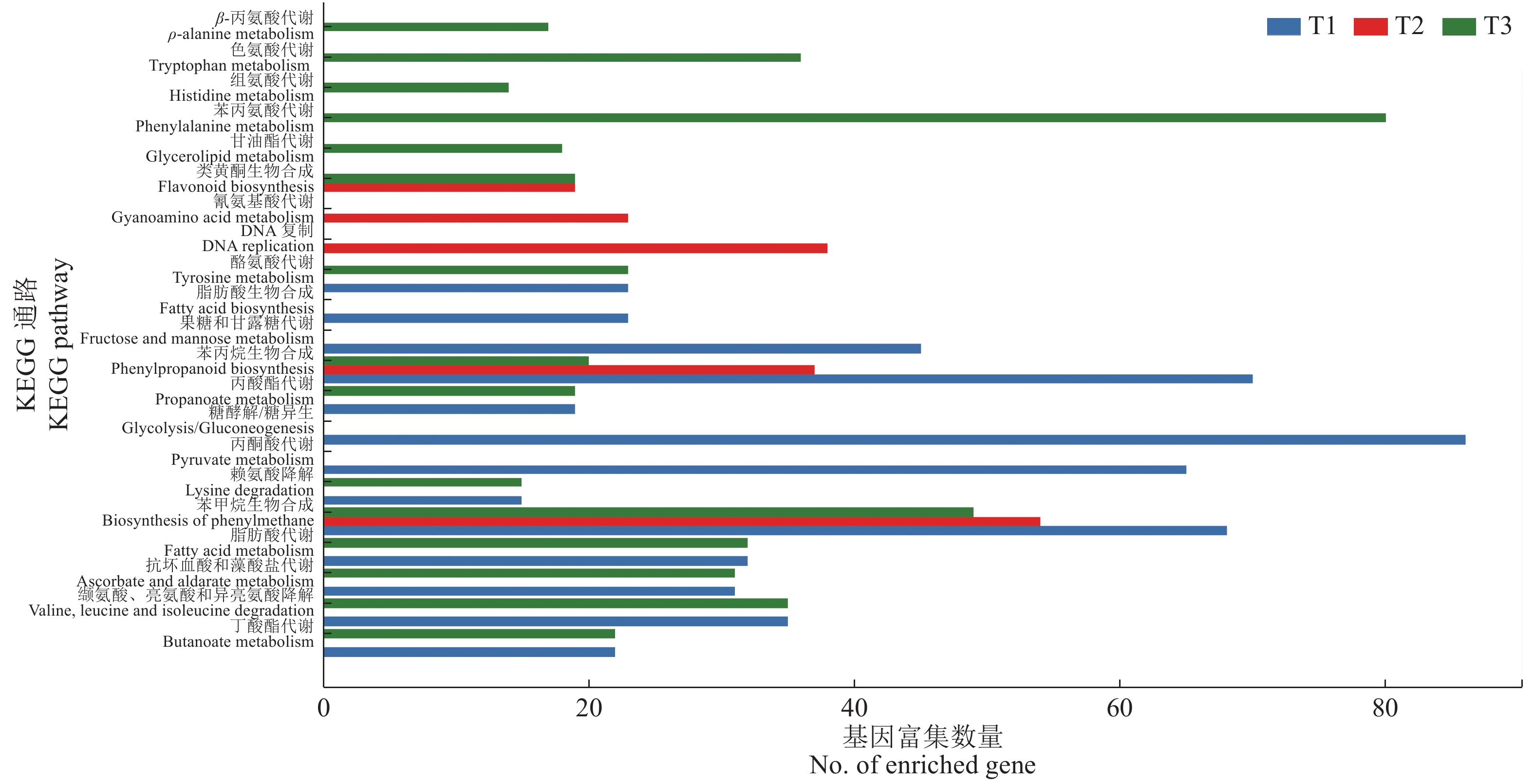 图 5 3种胁迫处理中尾叶桉差异表达基因的KEGG分析 Fig. 5 KEGG analyses of differentially expressed genes of Eucalyptus urophylla in three stress treatments T1:水肥双因素胁迫,T2:水分单因素胁迫,T3:养分单因素胁迫 T1: Water and nutrient deficiency stress, T2: Water deficiency stress, T3: Nutrient deficiency stress |