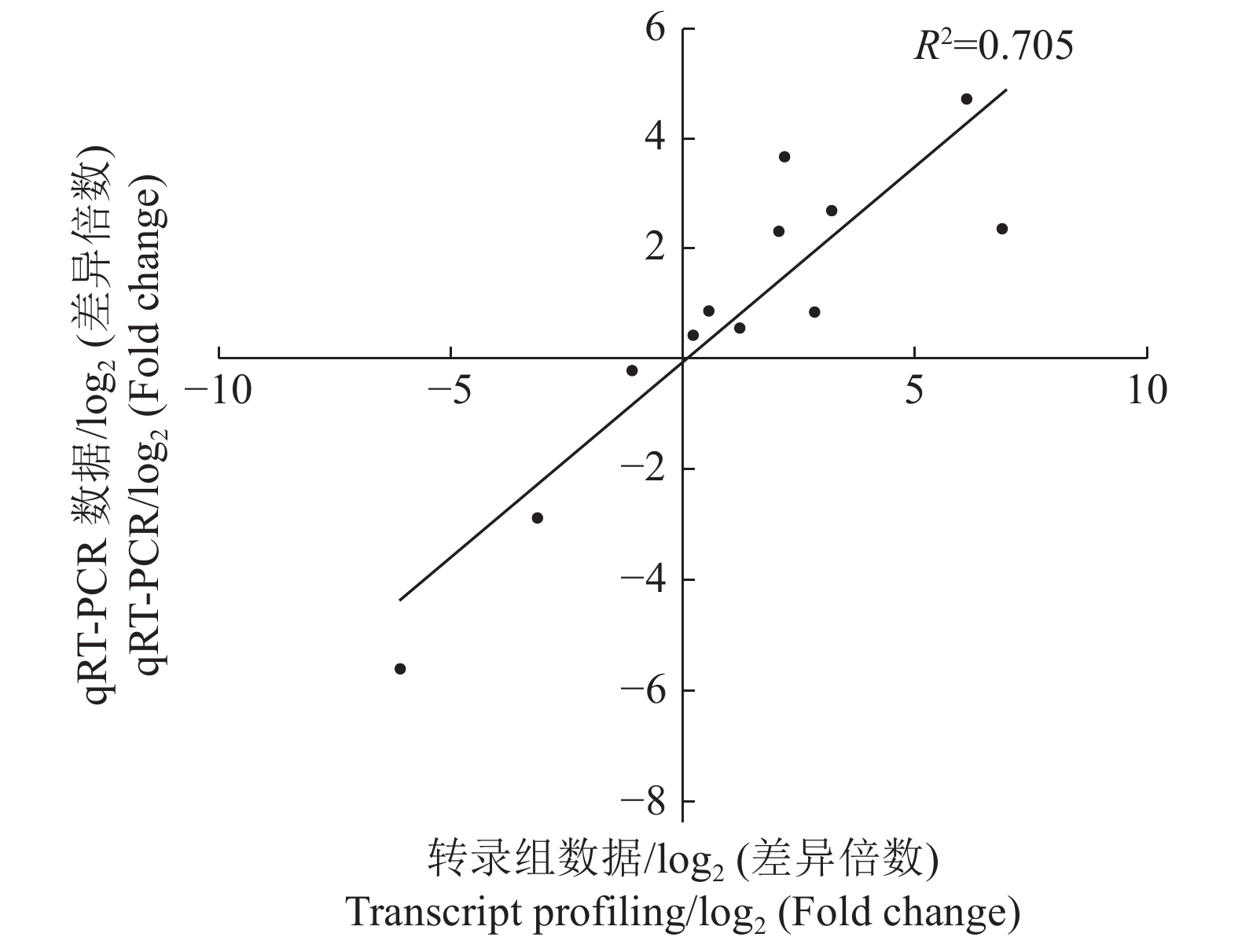 为了验证转录组测序数据的可信度,随机选取4个具有不同表达模式的差异表达基因进行qRT-PCR验证。结果(图6)显示:转录组测序获得的数据与qRT-PCR结果相关性较高,R2 = 0.705,说明转录组测序结果可靠。