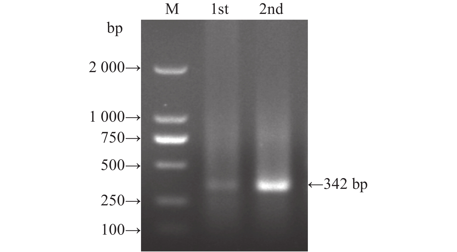 1.3 引物的设计与合成针对星状病毒RdRp基因的保守区域,参照文献[10]设计引物,预计扩增产物的大小为342 bp,引物由广州天一辉远生物科技有限公司合成。引物序列信息见表1。