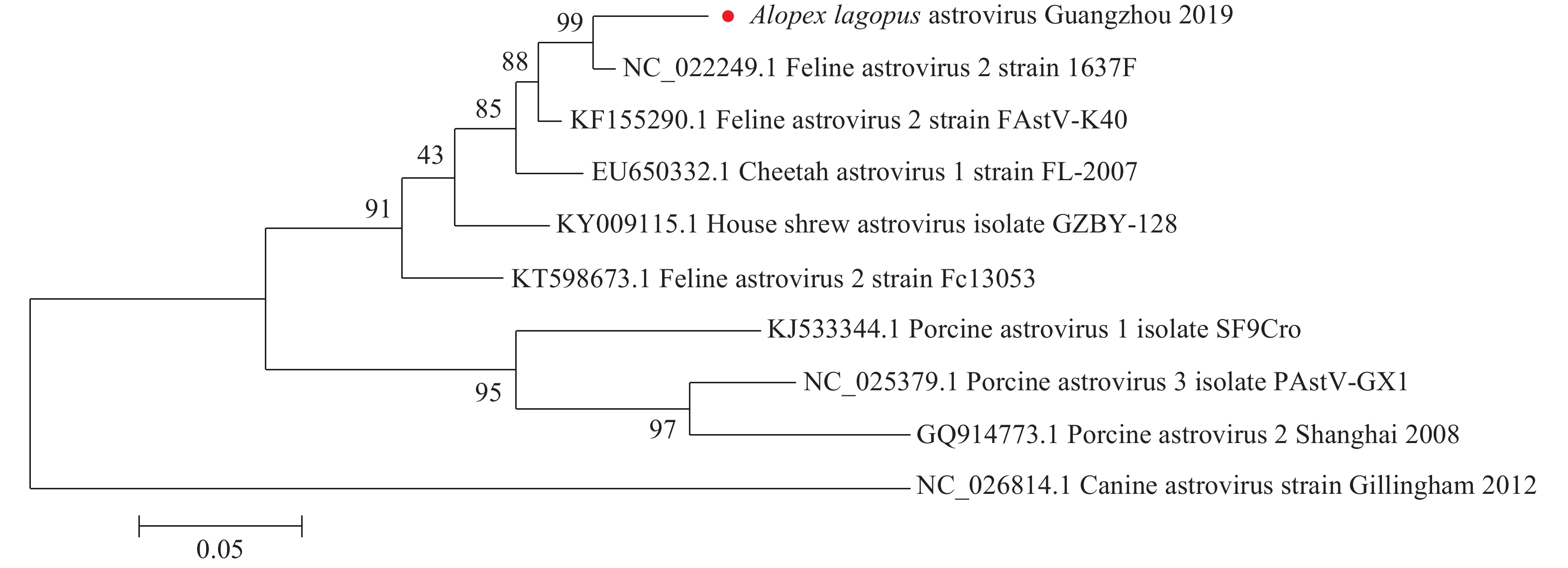 图 2 白狐肾脏星状病毒RdRp基因系统进化树 Fig. 2 Phylogenetic tree of astrovirus RdRp gene in kidney of Alopex lagopus “●”为本研究鉴定出的白狐源星状病毒毒株 “●” represents Alopex lagopus astrovirus strain identified in this study |