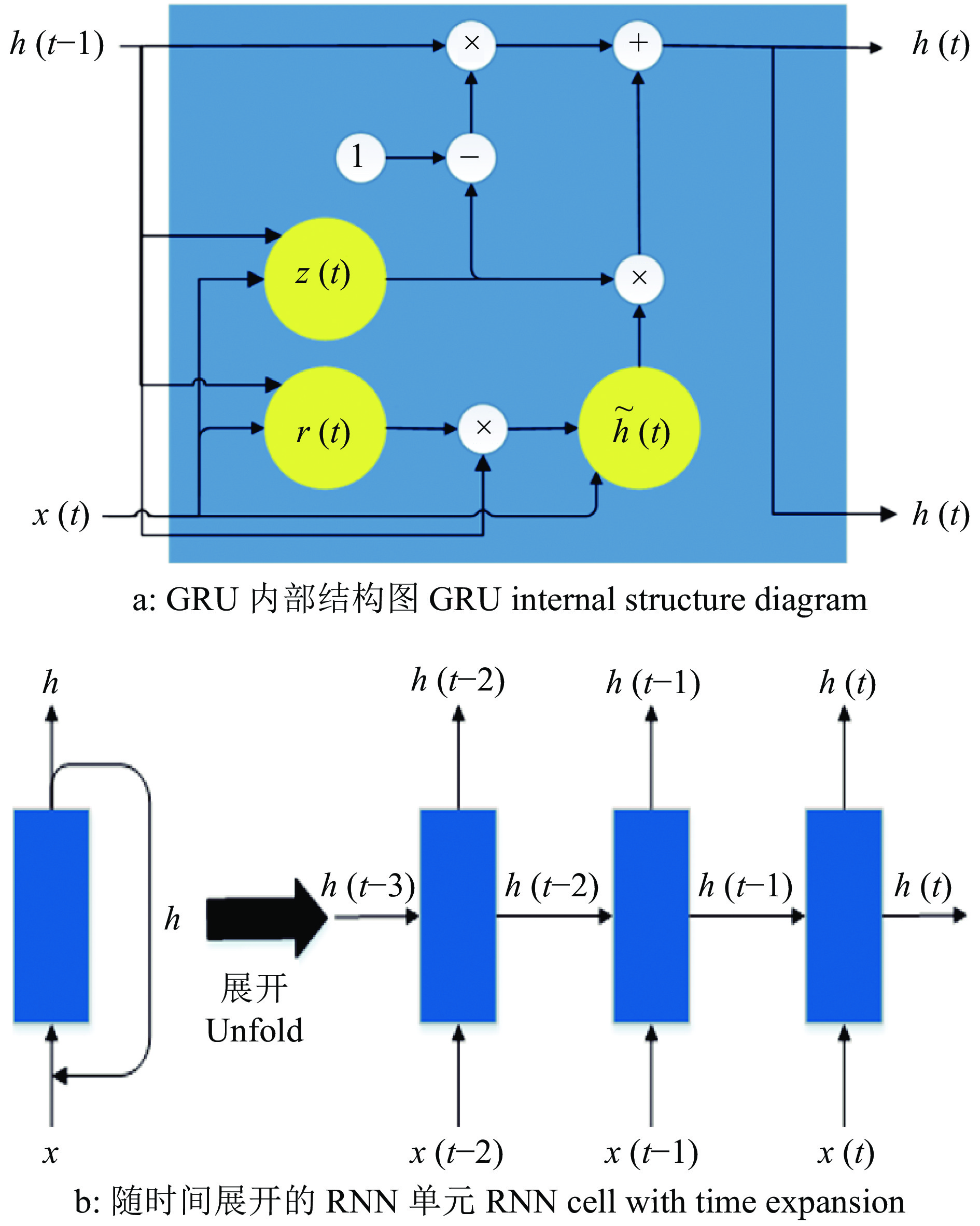 1 研究方法 1.1 门控循环单元网络算法门控循环单元网络(Gated recurrent unit,GRU)内部结构如图1a所示。GRU是一种在长短期神经网络(Long short-term memory,LSTM)基础上进行改进的循环神经网络(Recurrent neural network,RNN) 算法[28-29],图1b为随时间展开的RNN单元,该算法能够克服传统RNN算法梯度消失的问题。与LSTM相比,减少了训练所需的参数、降低模型复杂度、提升训练效率。