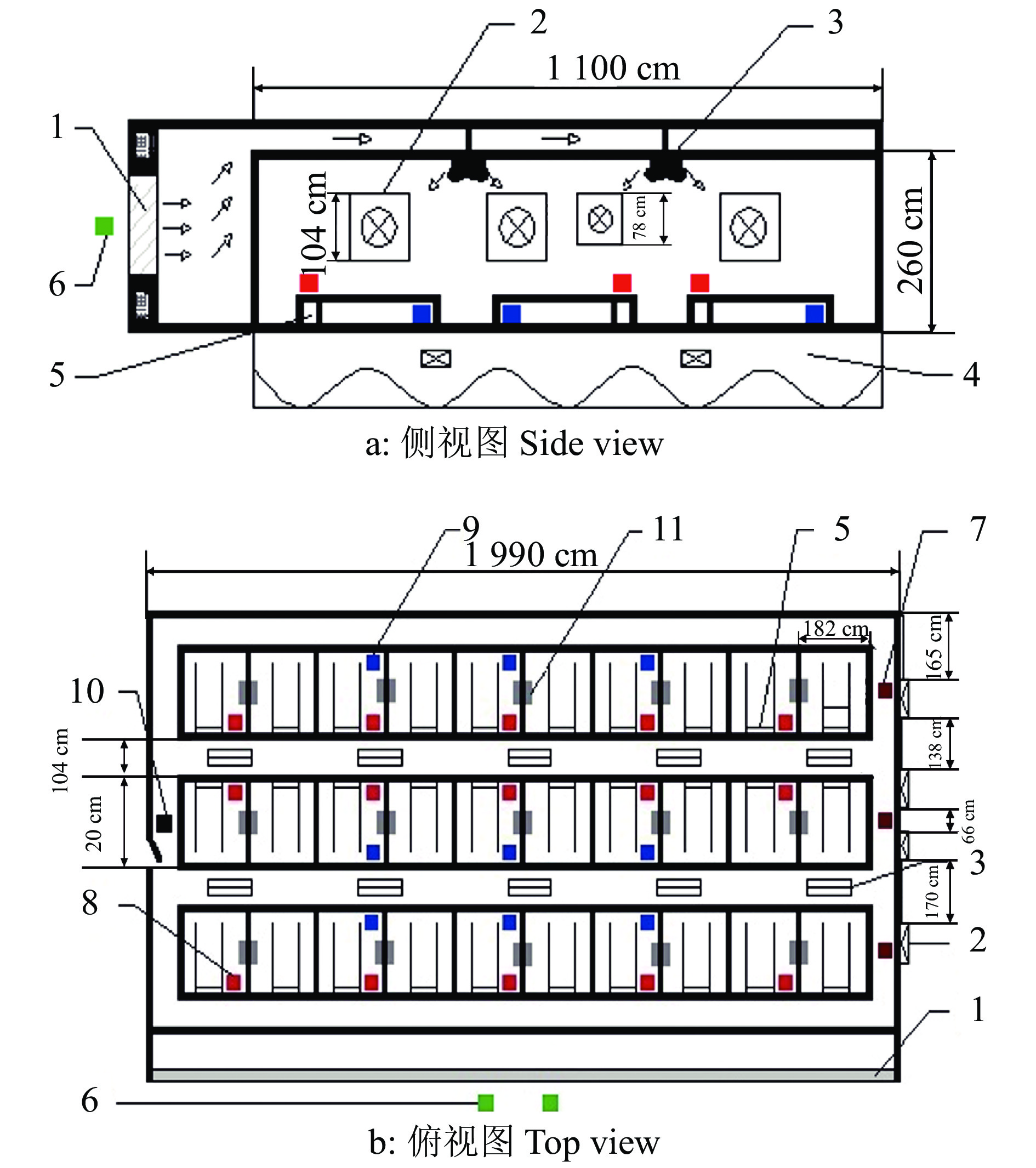图 4 试验分娩舍侧、俯视图及各区域节点分布 Fig. 4 Side and top views of test farrowing pig house and node distribution in each region 1:湿帘, 2:负压风机, 3:屋顶小窗,4:地沟,5:限位栏,6:传感器从节点(舍外),7:传感器从节点(出风口区域),8:传感器从节点(母猪呼吸区域),9:传感器从节点(仔猪呼吸区域),10:网关主节点,11:保温灯 1:Wet curtain, 2:Negative pressure fan, 3:Roof window, 4:Trench, 5:Limit column, 6:Sensor slave node(outisde), 7:Sensor slave node(outlet area), 8:Sensor slave node(sow breathing area), 9:Sensor slave node(piglet breathing area), 10:Gateway master node, 11:Heat lamp |