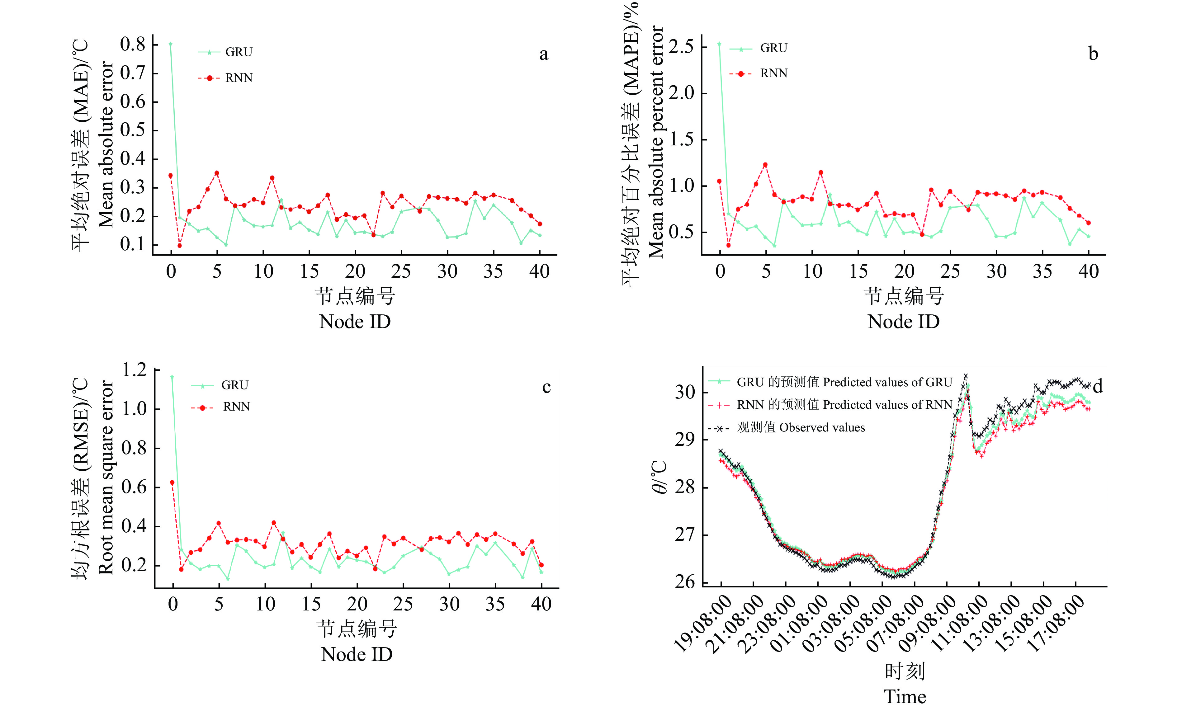 表 1 温度预测试验中GRU和RNN时间序列模型的指标1) Table 1 Indexes of GRU and RNN time series models in temperature prediction test |