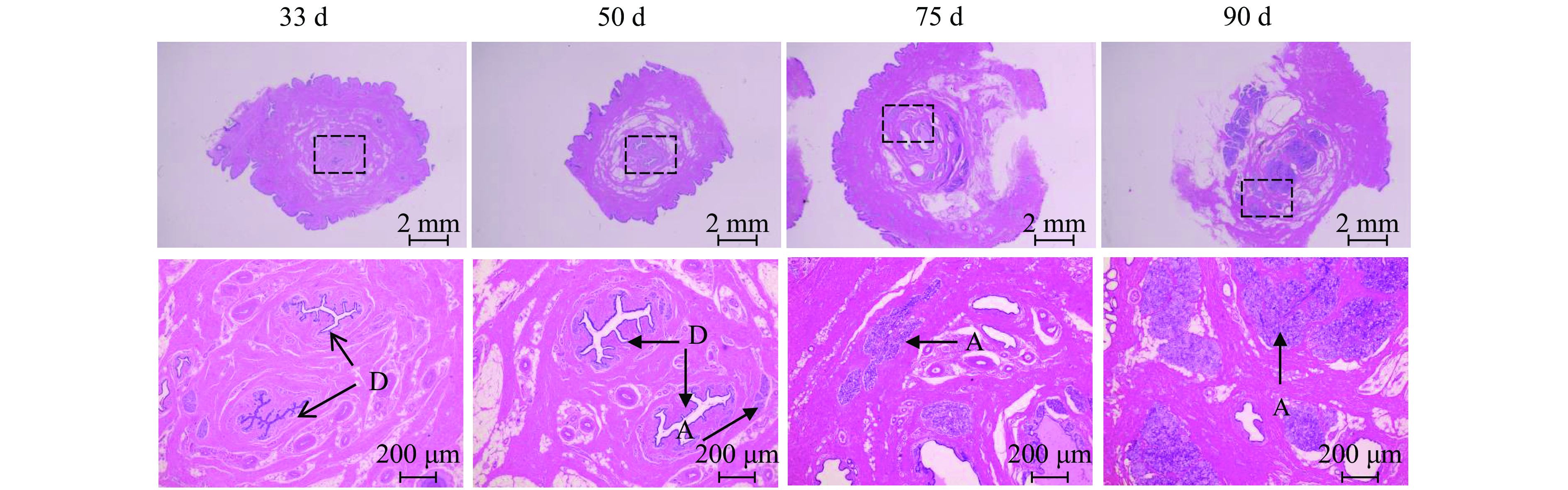 图 1 藏猪妊娠期不同时间点乳腺形态 Fig. 1 Mammary gland morphology in Tibetan pigs at different time points during gestation D:乳腺导管;A:乳腺腺泡 D: Mammary ducts; A: Mammary alveolus |