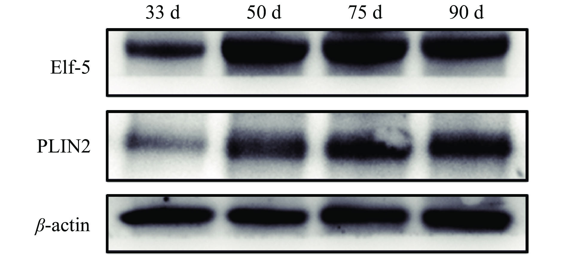 Elf-5在妊娠期和哺乳期对乳腺腺泡的增殖和分化有重要作用,是调节乳腺发育中必不可少的调控因子[17-18]。PLIN2是调控乳脂生成的关键分子[19]。我们的研究结果显示,Elf-5和PLIN2在妊娠50 d后表达量显著升高,结合乳腺的形态和Elf-5、PLIN2蛋白水平,说明50 d乳腺开始发育出腺泡,75 d乳腺进入快速发育的阶段,90 d达到更高的发育程度,其中主要是腺泡结构。