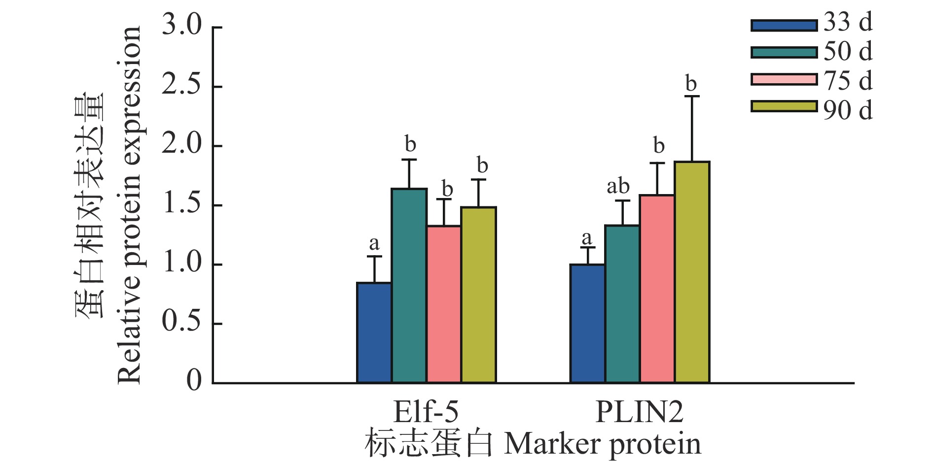 利用Western blot方法检测了藏猪妊娠期不同时间点乳腺发育标志蛋白Elf-5和PLIN2的表达,结果发现,在妊娠50、75和90 d时,Elf-5蛋白表达水平显著高于33 d;PLIN2的蛋白水平在75和90 d时显著高于33 d (图2、图3)。