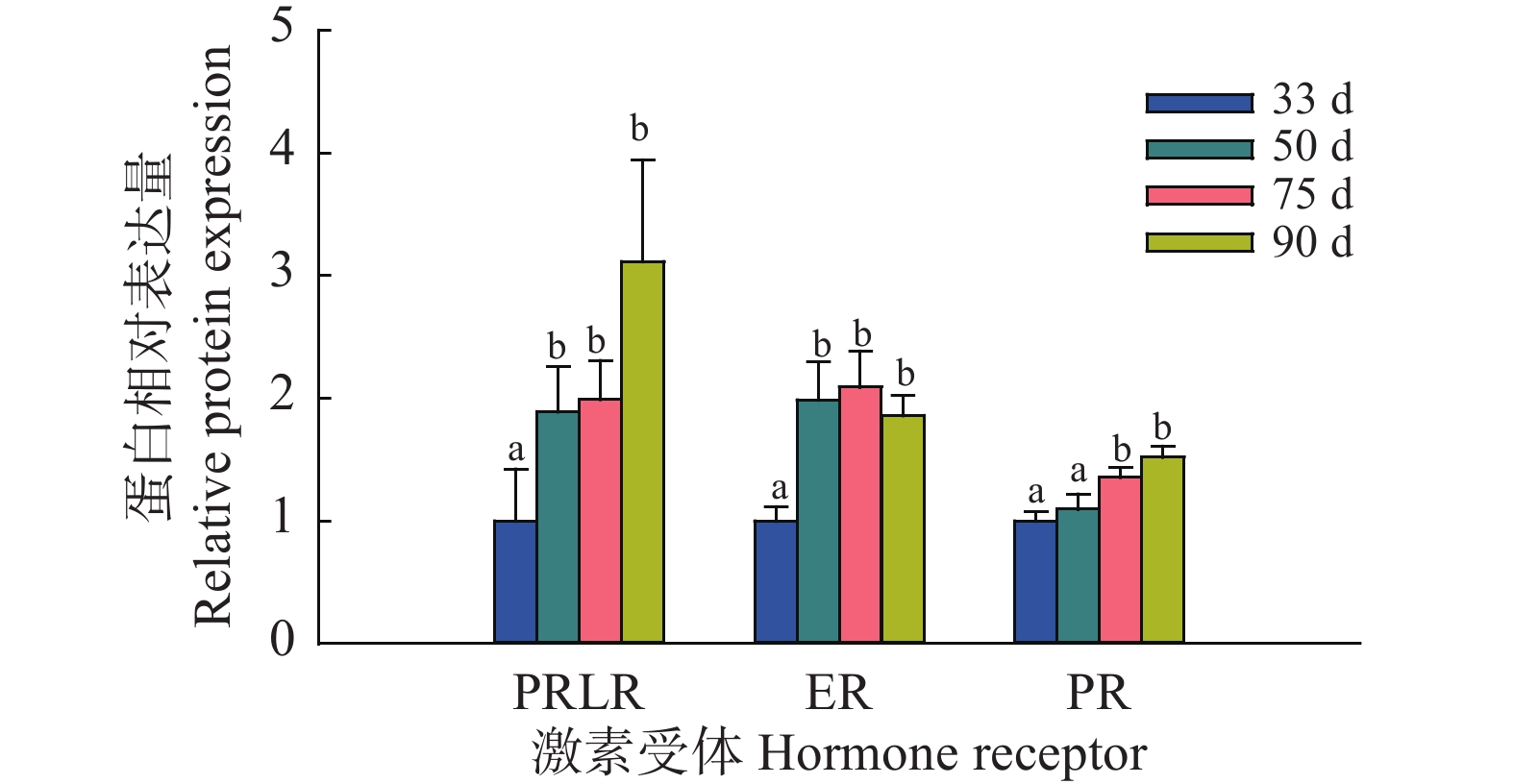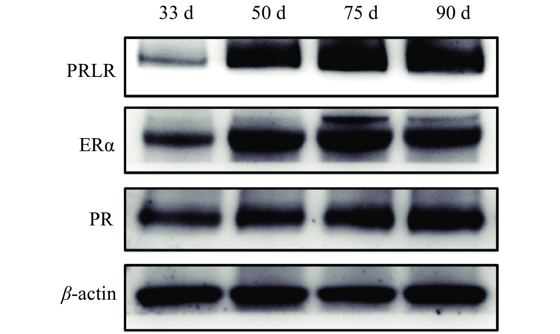 利用Western blot方法检测了藏猪妊娠期不同时间点乳腺中激素受体的蛋白表达。结果显示,妊娠50 d时PRLR表达水平显著高于33 d,在90 d时达到最高;ER表达水平在50 d时显著增加,在50、75和90 d时水平相当;在75 d时PR表达水平显著高于33和50 d,在90 d时达到更高(图4、图5)。