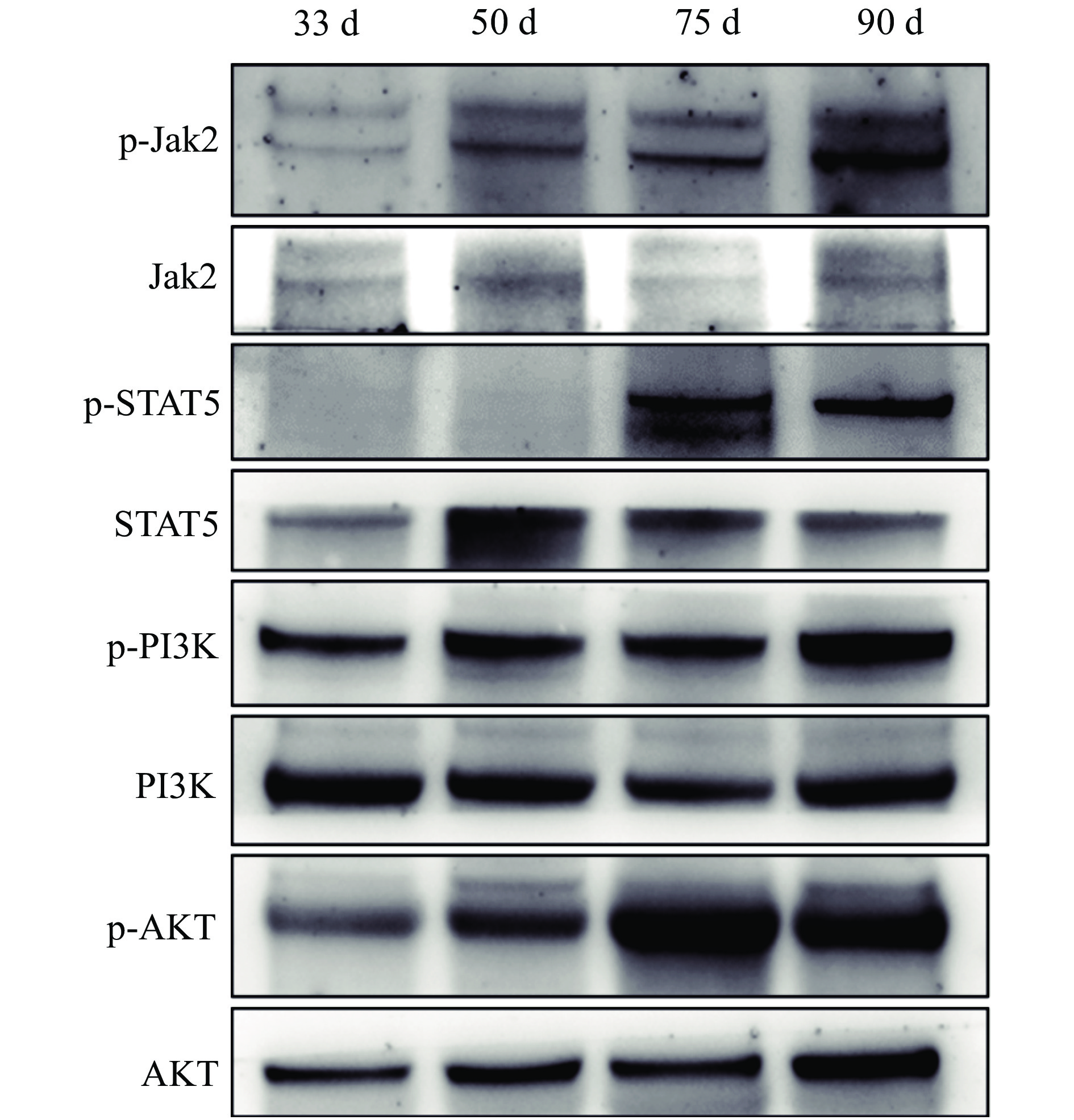 图 6 藏猪妊娠期不同时间点乳腺中Jak2/STAT5和PI3K/AKT信号通路蛋白的电泳图 Fig. 6 Electropherograms of proteins from Jak2/STAT5 and PI3K/AKT signaling pathways at different time points during gestation in mammary glands of Tibetan pigs |