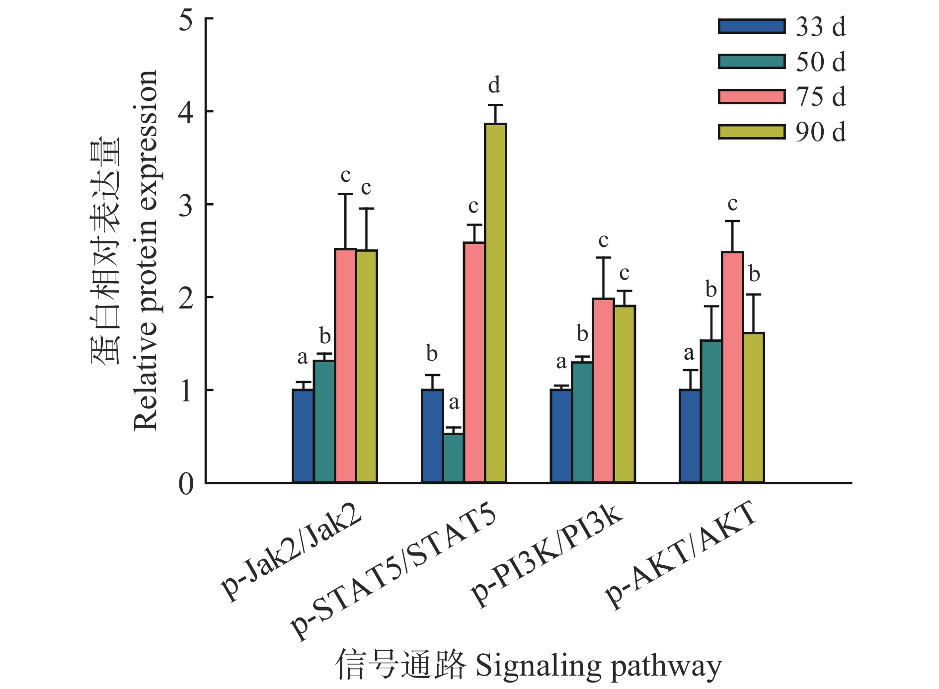 图 7 藏猪妊娠期不同时间点乳腺中Jak2/STAT5和PI3K/AKT信号通路的蛋白相对表达量 Fig. 7 Relative expressions of proteins from Jak2/STAT5 and PI3K/AKT signaling pathways at different time points during gestation in mammary glands of Tibetan pigs 相同信号通路柱子上方的不同小写字母表示差异显著(P<0.05,Duncan’s法) Different lowercase letters on bars of the same signaling pathway indicate significant differences (P<0.05,Duncan’s method) |