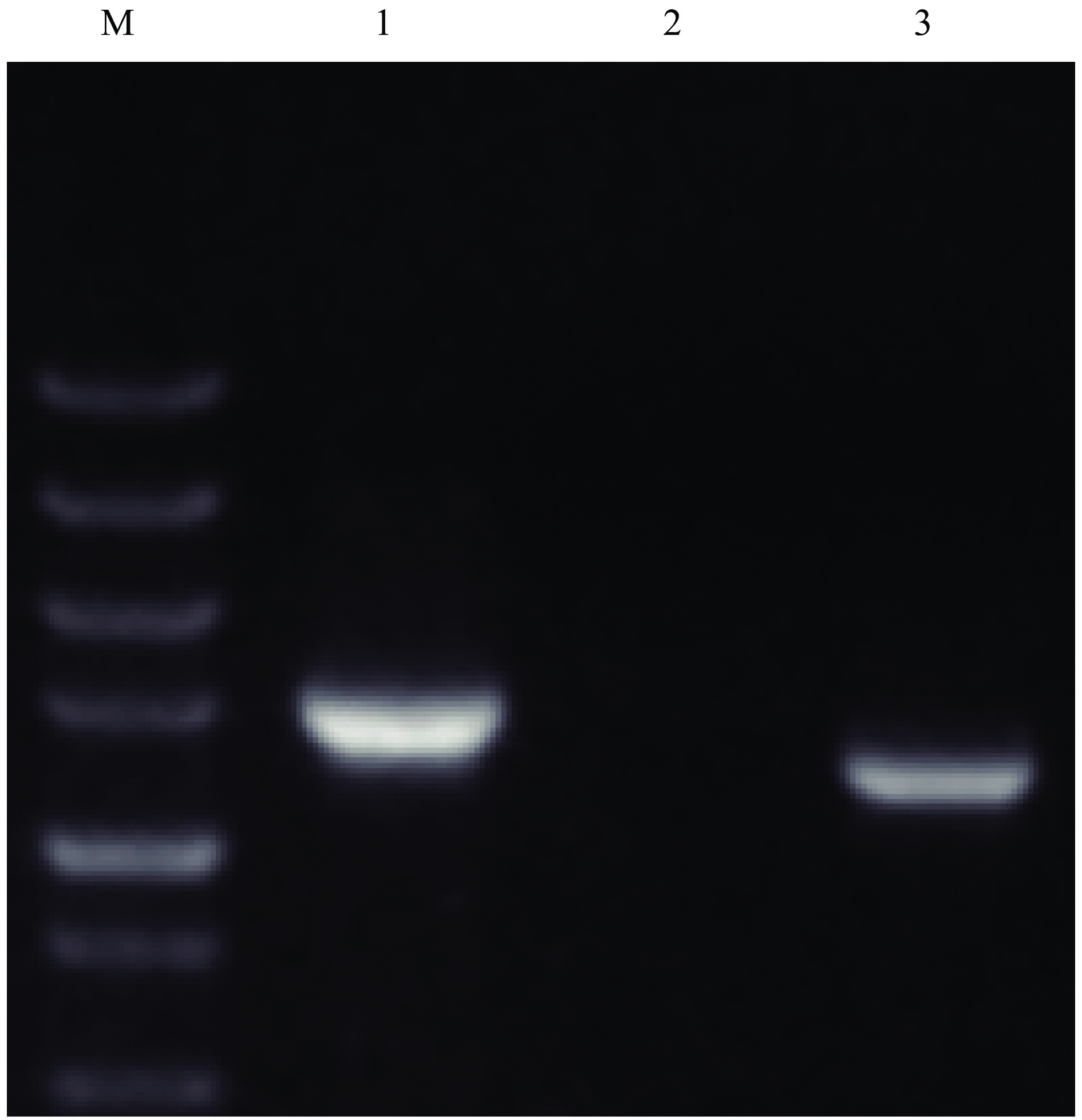 图 3 β-甘露聚糖酶基因序列特异性扩增电泳结果 Fig. 3 The electrophoresis results of specific amplification of β-mannanase gene sequence M:DS 5000 marker;1:16S rDNA;2:枯草芽孢杆菌β-甘露聚糖酶基因;3:解淀粉芽孢杆菌β-甘露聚糖酶基因 M:DS 5000 marker;1:16S rDNA;2:β-mannanase gene from Bacillus subtilis;3:β-mannanase gene from B. amyloliquefaciens |