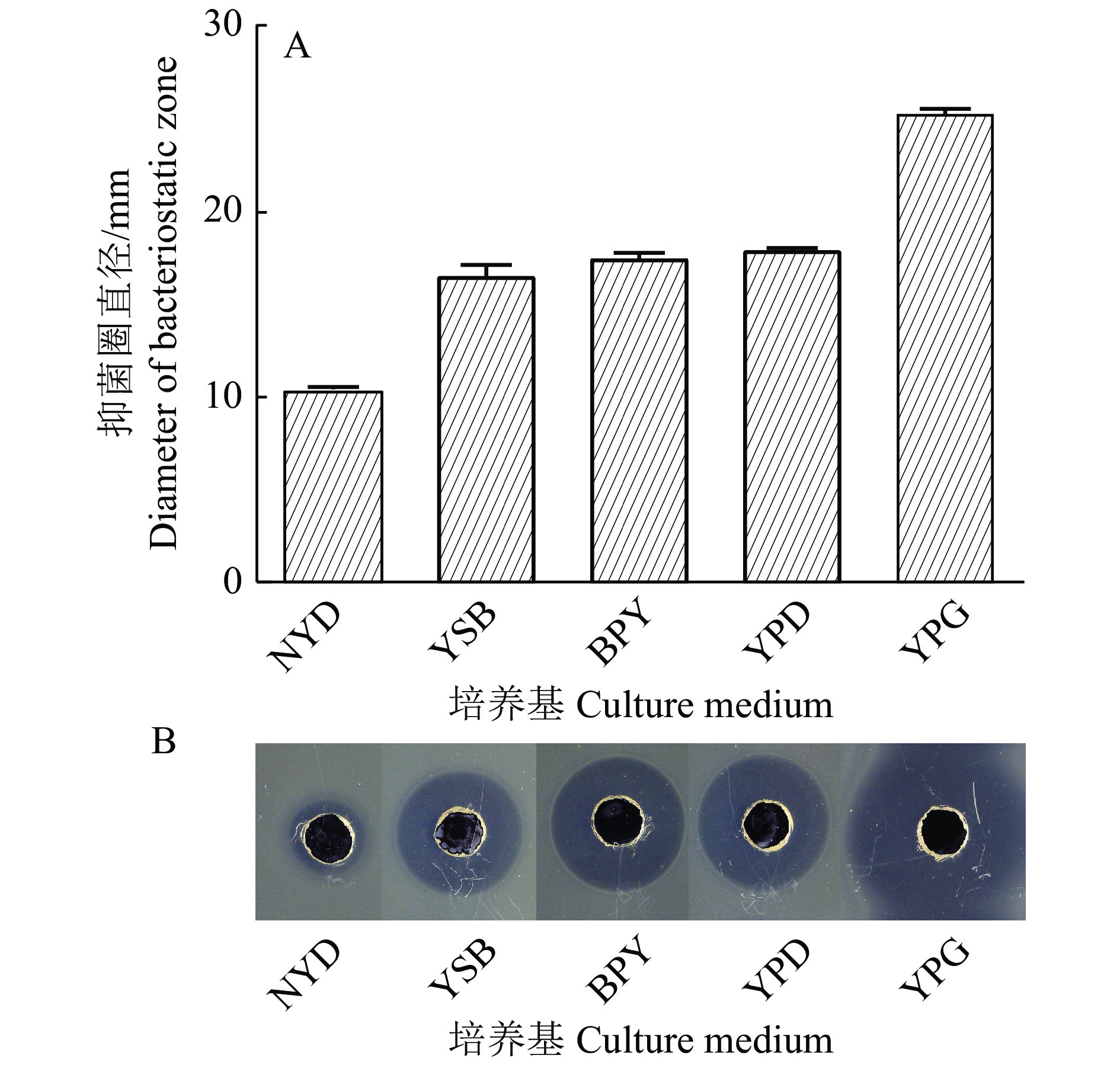 芽孢杆菌可以分泌多种抗菌活性物质到胞外拮抗其他微生物的生长,而拮抗物质的表达分泌受外界环境条件的诱导和影响[28]。为确定E3产抑菌物质的最优培养基,通过比较E3无菌培养液抑菌圈的大小,从5种常用培养基中筛选了E3产抑菌活性物质最多的培养基(图4)。从图4可以看出,在营养丰富的YPG培养基中,E3菌株无菌培养液的抑菌圈最大,表明其分泌到胞外的抑菌活性物质最多,故选择YPG培养基培养E3菌株提取抗菌活性物质。