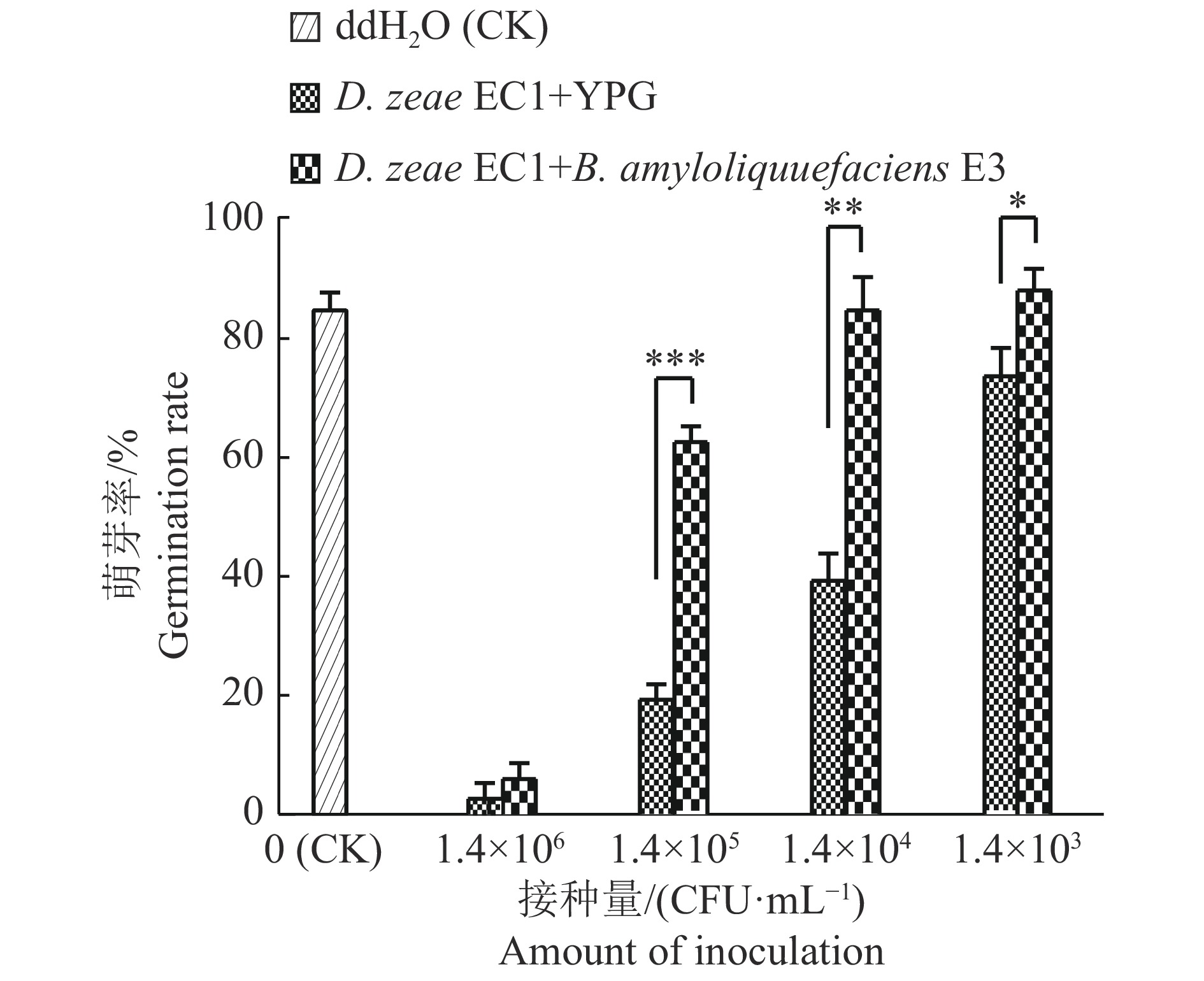 1.2.4 E3菌株无菌培养液对D. zeae EC1侵染水稻种子能力的影响采用纸培法[23]测定E3菌株对D. zeae EC1侵染水稻种子能力的影响。选取健康饱满的水稻种子(‘金刚30’),用双蒸水冲洗4次备用。首先,准备9份水稻种子,每份包含30粒种子;其中8份用于接种D. zeae EC1并分为接种对照组(4份)和接种试验组(4份),每组的4份种子进行相同的接种程序,分别用1.4×106、1.4×105、1.4×104和1.4×103 CFU/mL的D. zeae EC1菌液浸泡,在28 ℃条件下浸泡5 h后,用无菌水冲洗种子3次;另外1份用无菌水处理作为空白对照。将这9份种子分别置于垫有3~4张滤纸(无菌水湿润)的培养皿中,放入恒温培养箱,培养设置参数为:昼夜温度为30 ℃/20 ℃,光照时间为16 h。在保湿培养24 h后,接种试验组的种子喷洒 2 mL 无菌E3培养液,使每一粒种子均匀覆盖培养液,接种对照组和空白对照则采用相同方法用YPG培养基处理。置于培养箱保湿培养每天观察种子萌发情况,4 d 后统计种子萌发情况,计算萌芽率。试验重复3次。