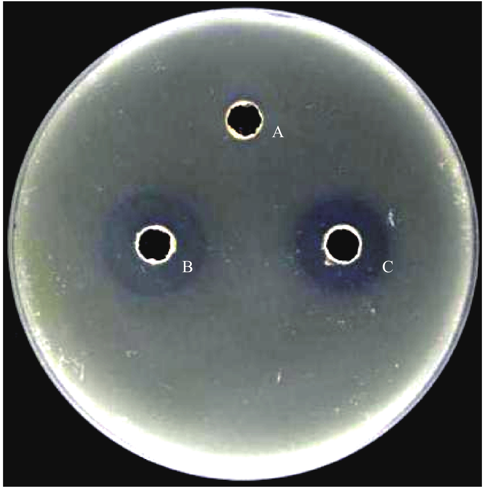 图 6 Bacillus amyloliquefaciens E3菌株粗提脂肽的抑菌活性 Fig. 6 Antimicrobial activity of crude lipopeptides extracted from Bacillus amyloliquefaciens E3 strain A:甲醇;B:无菌上清液;C:粗提脂肽类物质 A:Methanol;B:Sterile supernatant;C:The crude lipopeptides |