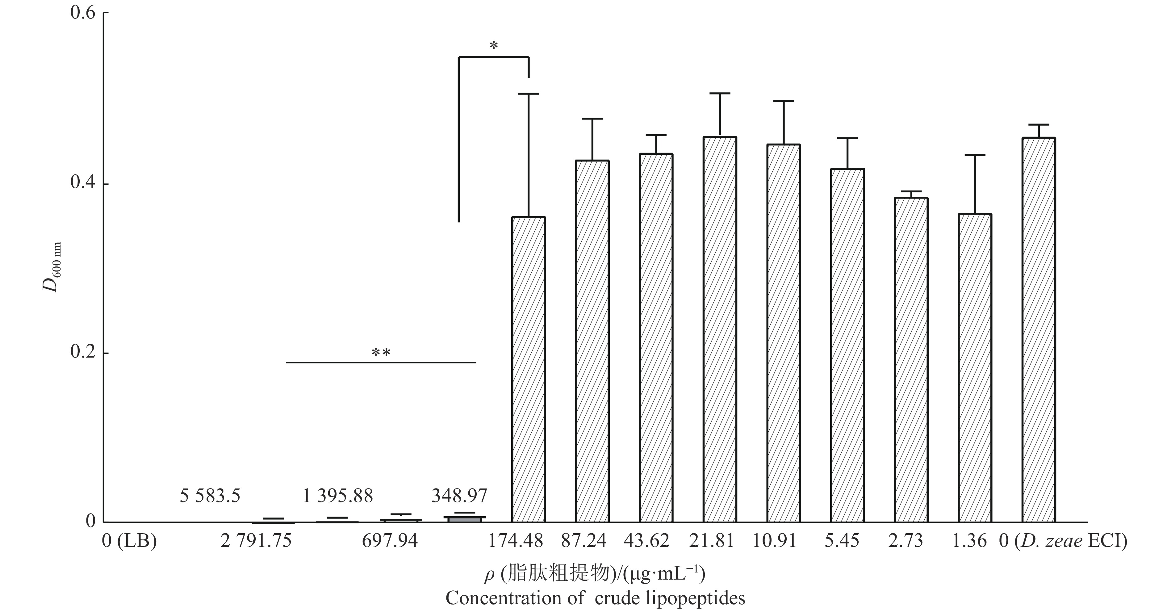 为了测定E3抑菌脂肽粗提物的MIC, 将粗提脂肽(5583.5 μg/mL)以2的倍数进行梯度稀释从20到2−12,与等量的D. zeae EC1混合加入96孔培养板内,振荡共培养24 h后利用酶标仪测定D600 nm。由图7可以看出,E3粗提脂肽质量浓度由1.36 μg/mL升到174.48 μg/mL时,D600 nm与阳性对照(0 μg/mL+EC1)无显著差异,表明其不能抑制D. zeae EC1的生长;而当浓度升高到348.97 μg/mL及以上时,D600 nm与阴性对照(LB培养基)无显著差异,表明其几乎完全抑制了D. zeae EC1的生长。阴性对照LB培养基D600 nm为0,说明LB不存在其他微生物的污染。这些结果表明E3脂肽粗提物可以有效抑制D. zeae EC1的生长,最小抑菌浓度为348.97 μg/mL。