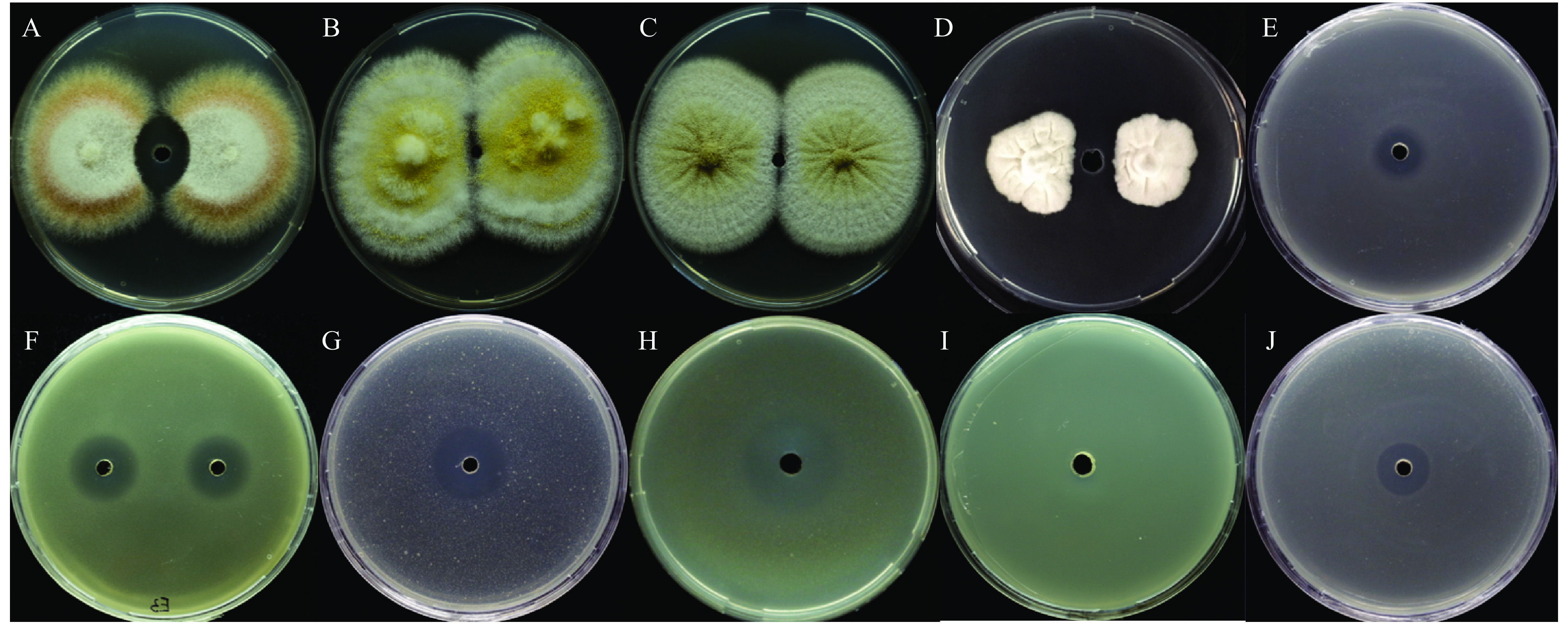 图 8 Bacillus amyloliquefaciens E3菌株的抗真菌谱 Fig. 8 The antimicrobial spectrum of strain Bacillus amyloliquefaciens E3 strain A:茄病镰刀菌Fusarium solani;B:黄曲霉Aspergillus flavus;C:黑曲霉Aspergillus niger;D:雪腐镰刀菌Fusarium nival;E:大肠埃希菌Escherichia coli;F:柑橘溃疡菌Xanthomonas citri pv. citri;G:水稻基腐病菌 Dickeya zeae EC1;H:茄科劳尔氏菌Ralstonia solanacearum;I:洋葱伯克氏菌Burkholderia cenocepacia;J:香蕉基腐病菌Dickeya zeae MS1 |