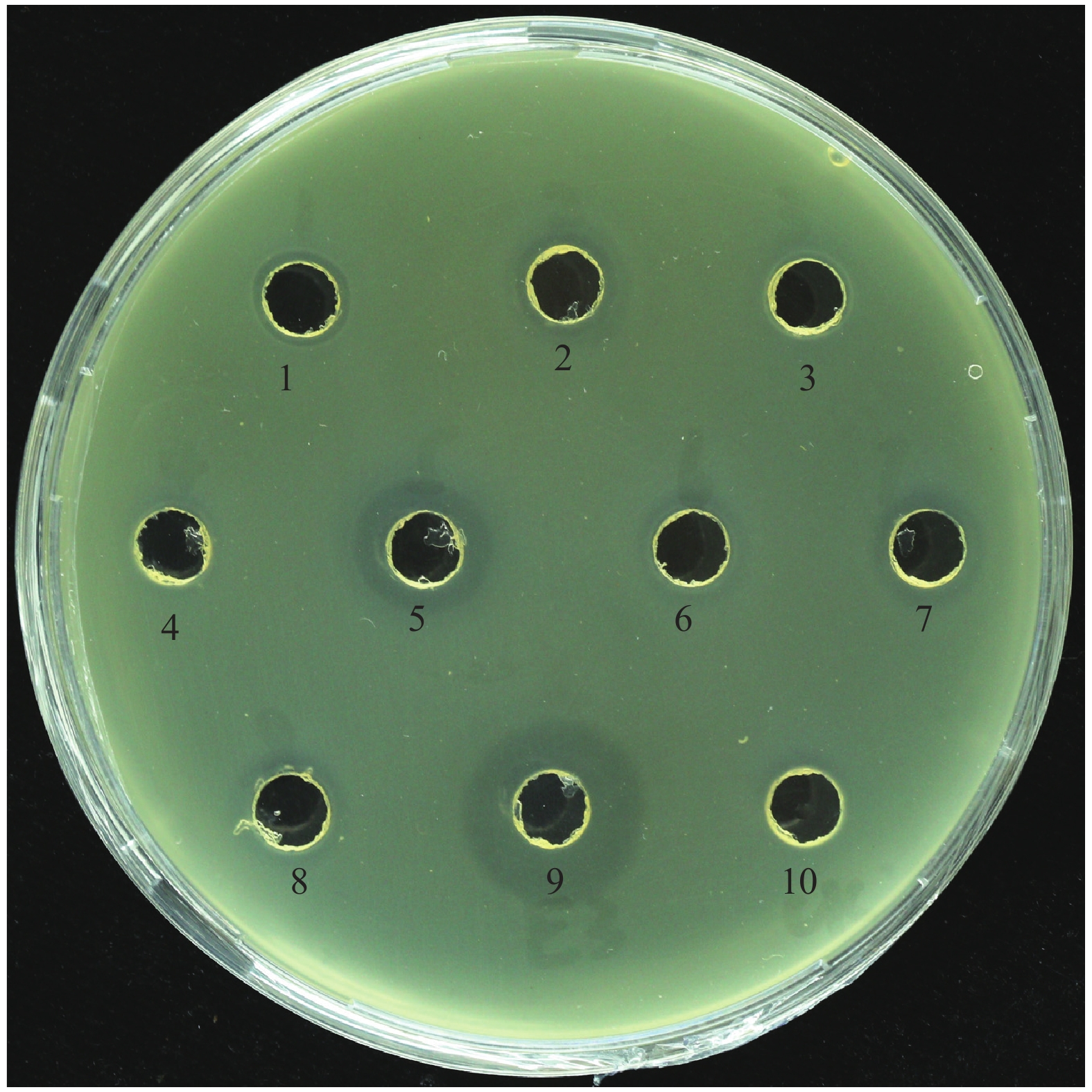 图 9 HPLC 纯化分离抑菌物质各馏分活性检测图 Fig. 9 Determination of antibacterial activity of each fraction isolated and purified by HPLC 1~8:HPLC收集的馏分;9:脂肽粗提物;10:甲醇 1−8: Fractions collected by HPLC; 9: Crude lipopeptides; 10: Methanol |