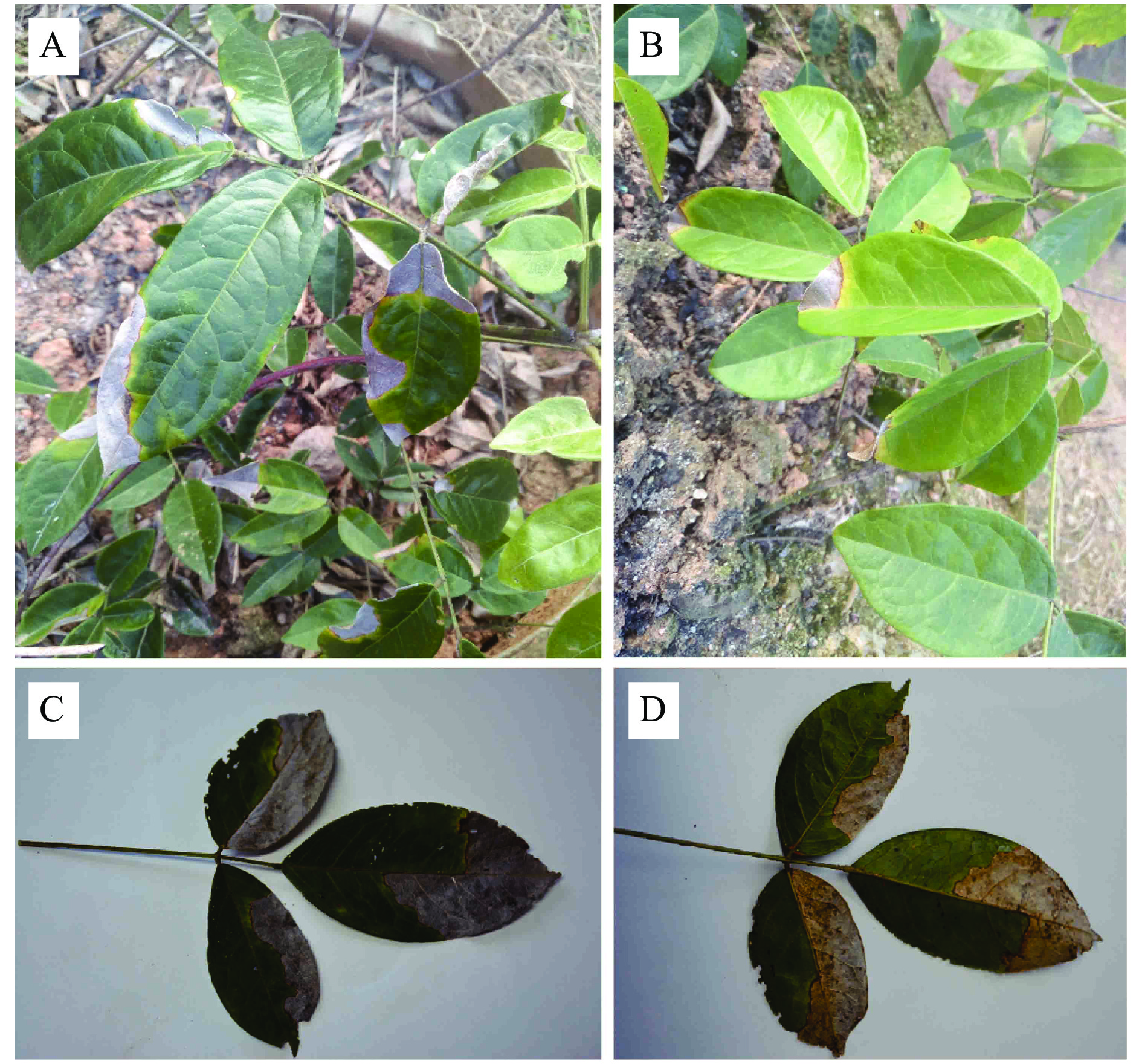 图 1 美丽崖豆藤的田间发病症状 Fig. 1 Symptoms of the diseased Millettia speciose in the field A 和B: 田间发病症状;C 和D:发病叶片的正、反面 A and B: Typical symptoms in the field; C and D: The adaxial side and abaxial side of diseased leaves, respectively |